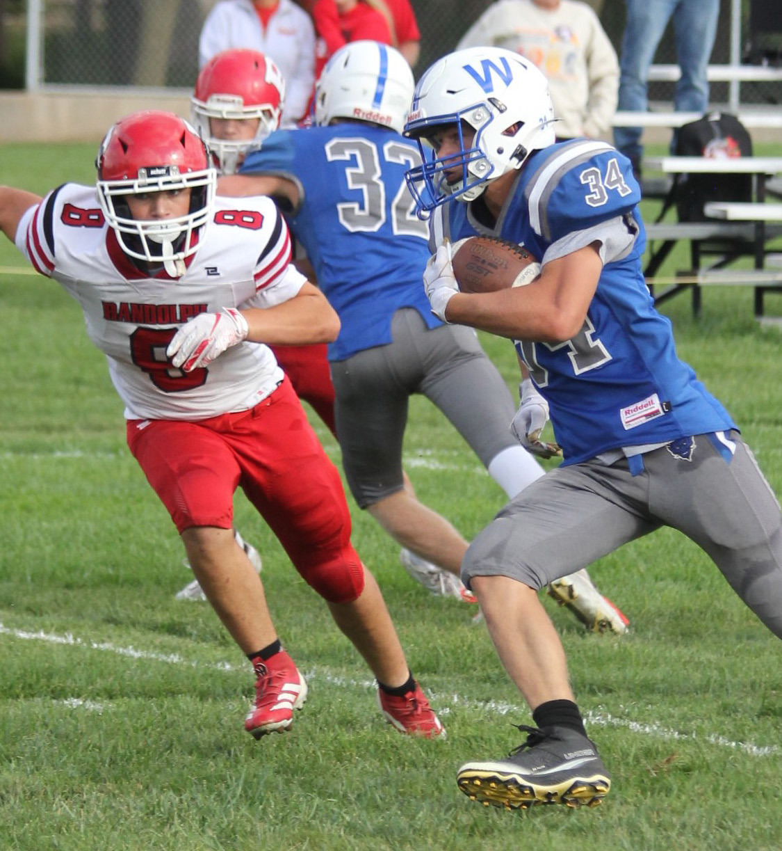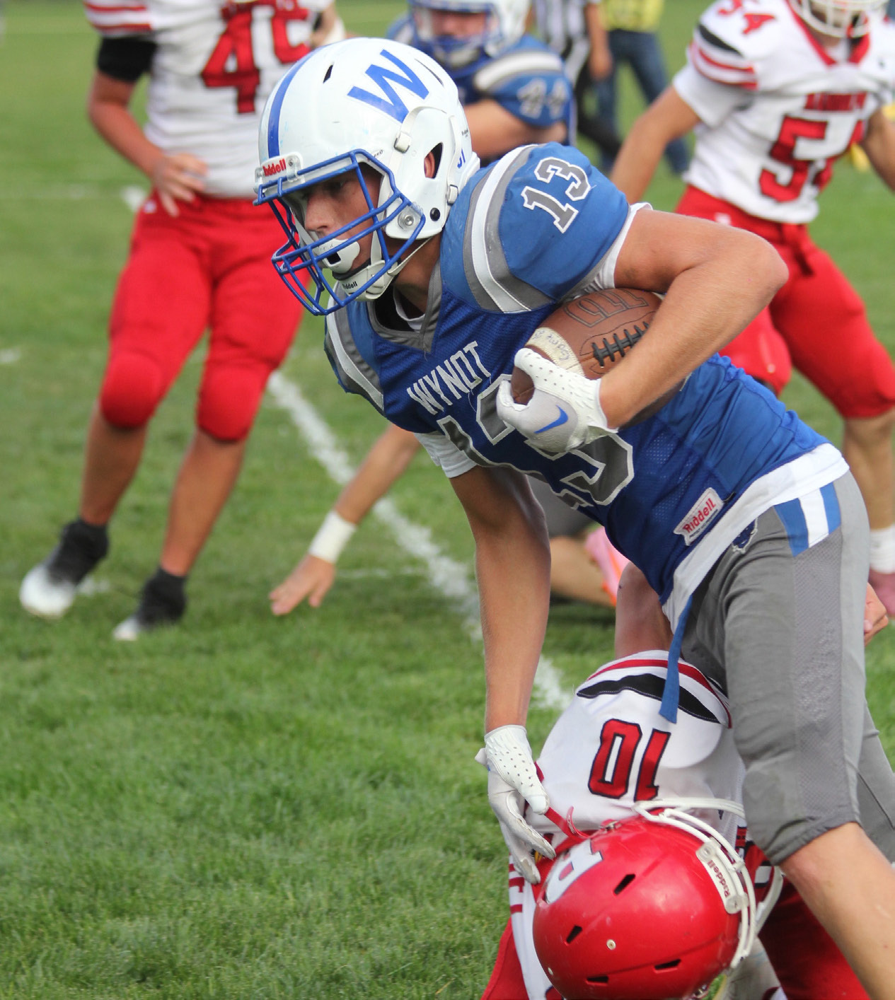 Both Wynot and Cedar Catholic kicked off their Homecoming festivities with large victories on the day. The Cedar Catholic defense (right) swarms over a Tekamah-Herman receiver during Cedar’s Homecoming football game. Cedar defeated Tekamah-Herman, 57-6. Wynot used a balanced offense in their Homecoming game against Randolph. Nixen Heimes bulls over the Randolph defender (below) during a 19yard reception. Lane Heimes (below, right) turns the corner and heads up field for a long gain. The Blue Devils beat the Cardinals, 67-6.