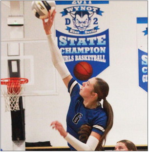 Kenna Oligmueller and Mya Pinkelman paced the Wynot attack with seven kills each in the match, Jordan Foxhoven slammed four and Haley Wieseler recorded 15 set assists.