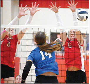 Cedar Catholic’s Calley Stewart and Savannah Pick attempt to block a kill during Cedar’s match against the Wayne Lady Blue Devils.