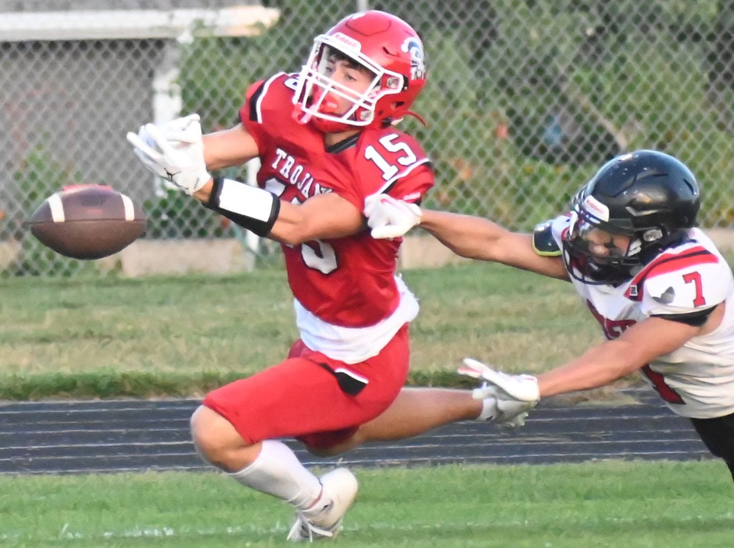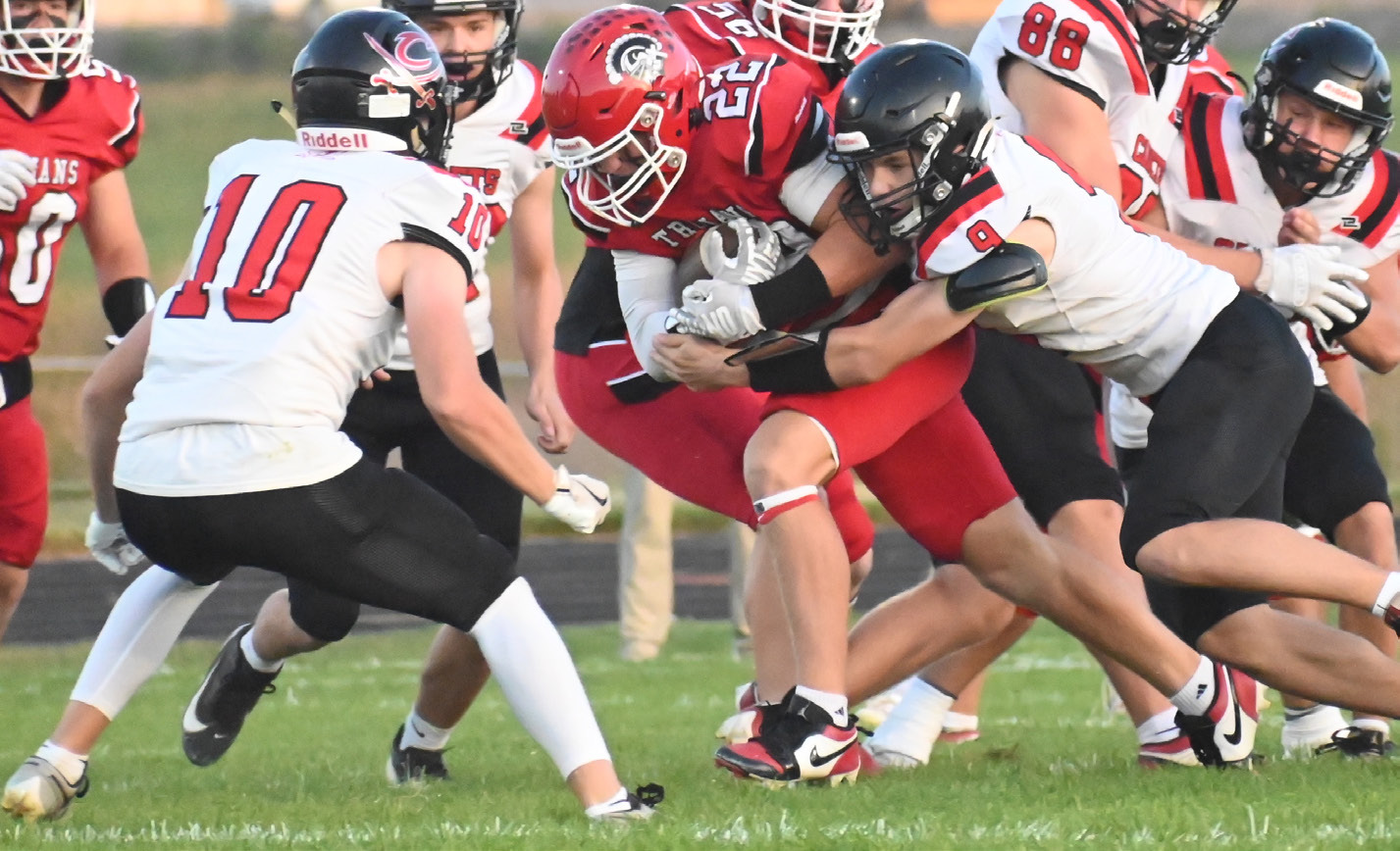 The Cedar Catholic Trojans defeated West Point Beemer Friday night at Russ Hochstein Field. Solid defense and a strong running game carried the Trojans to the win. (above) Will Steffen and Teyton Dendinger tackle the Cadets Myles Nielson during first half action of Friday’s game. (middle Mason Baller tries to haul in a pass as The Cadets Emmanuel Figuroa tries to break up the pass. (below) Brady Hochstein carries some West Point Beemer defenders with him as he tries to pick up extra yardage. Rob Dump | Cedar County News