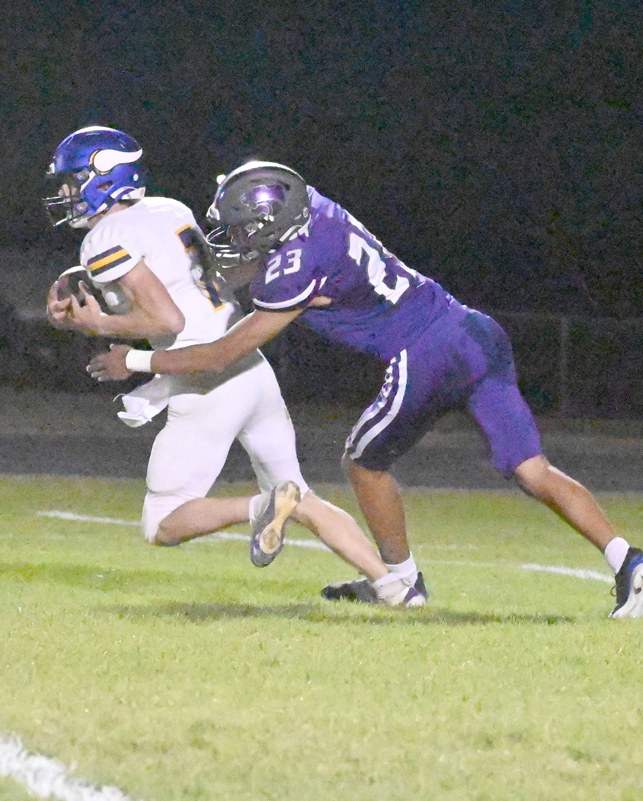 The Hartington-Newcastle Wildcat football team hosted the undefeated Wausa-Osmond Vikings Friday night at Russ Hochstein Field. Above, Mason Krause makes the Osmond- Wausa defender miss as he makes his way down field. Right, Brayden Lammers chases down the Vikings Mac Carlson.
