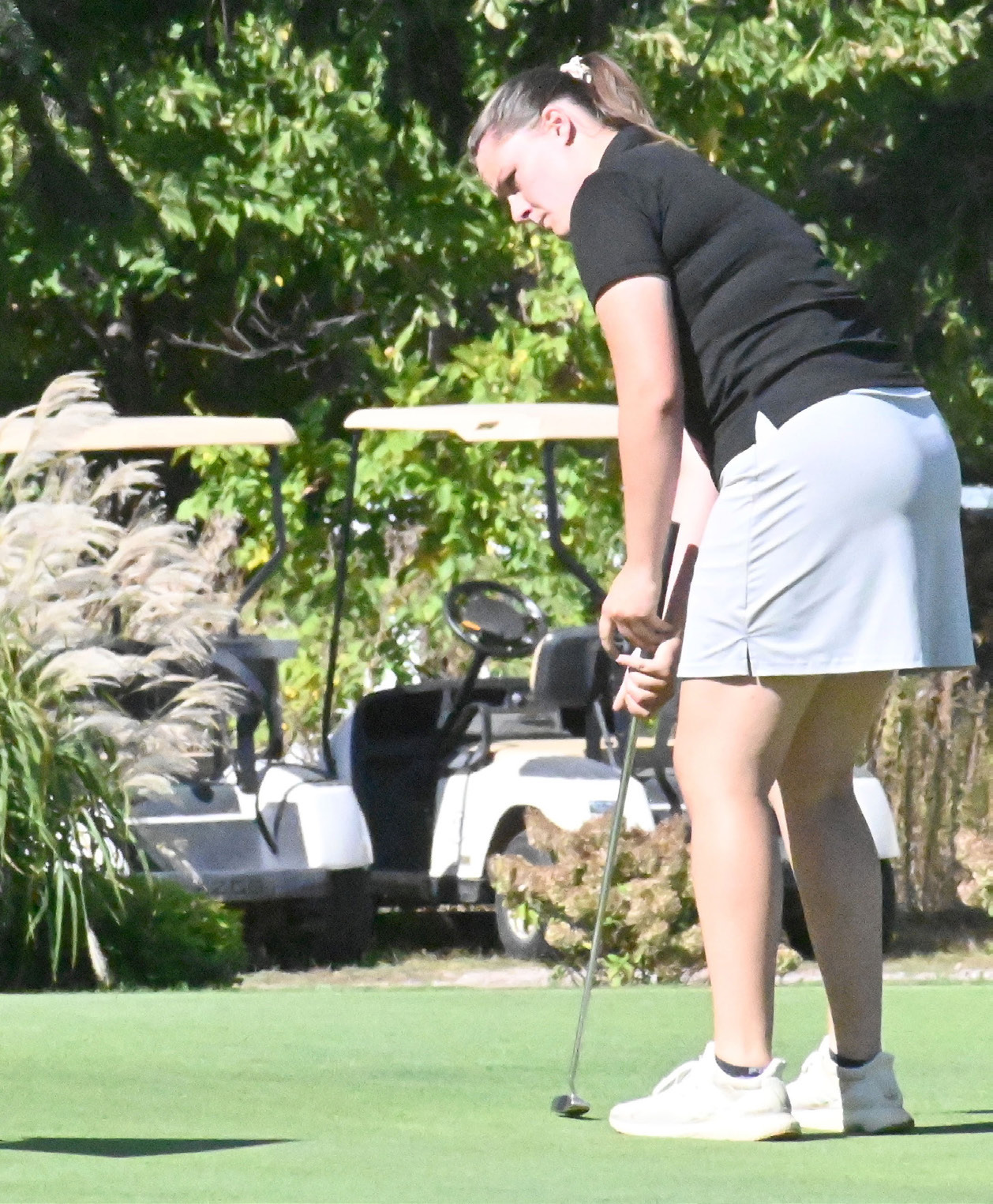 Last week Monday, the Cedar Catholic Girls golf team hosted a tournament in Hartington. Above, Kaley Lammers, Elsie Haahr and Grace Kruse each take their turn stepping up to the ball. Postseason began Monday for the local golf team as they competed in the District meet in Wayne.