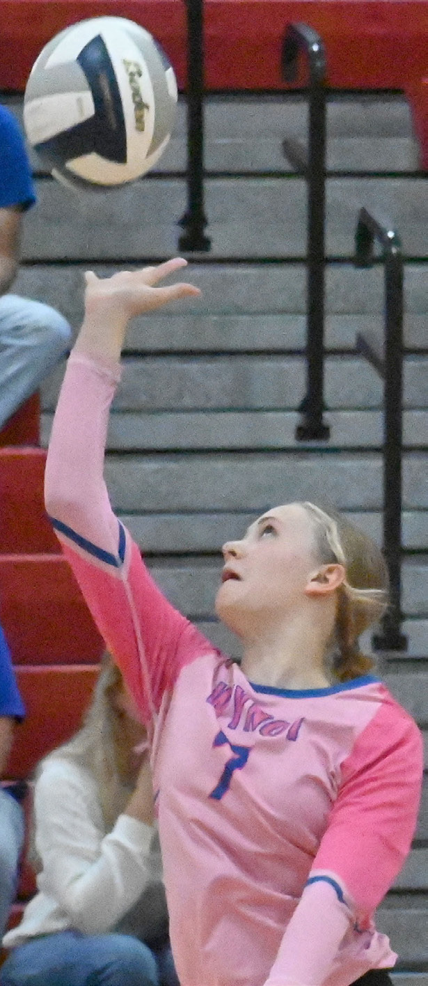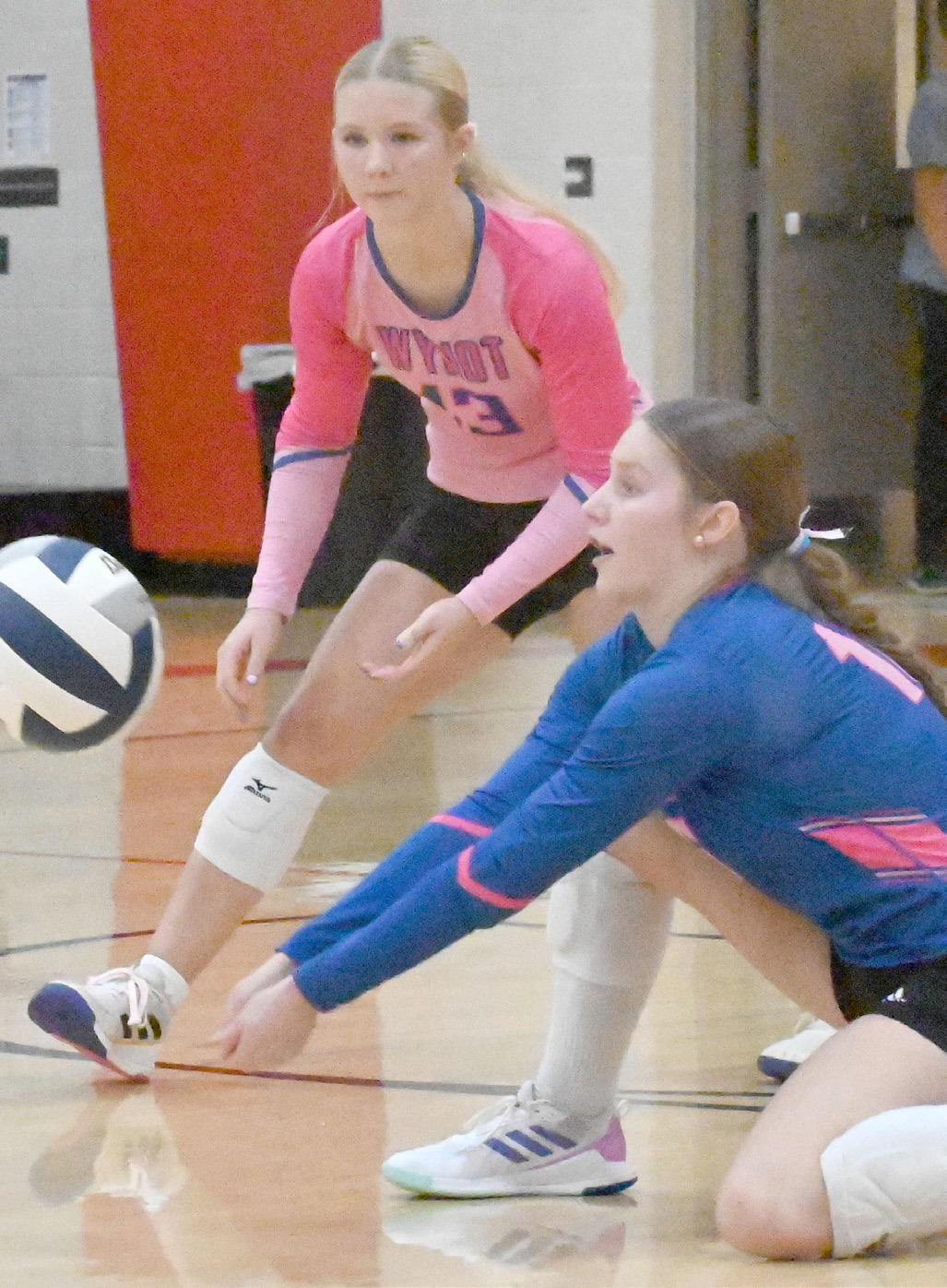 Wynot and Cedar Catholic tangled in a triangular Thursday night at the Msgr. Werner Activity Center. The Lady Blue Devils, rated first in the state in Class D2, earned the two-set win. (top) Kenna Oligmueller looks to find the hole as she tips the ball over the Cedar blockers. (right) Jaylin Geisen digs the Cedar Catholic attempt. (far right) Mya Pinkelman makes the athletic play at the net.