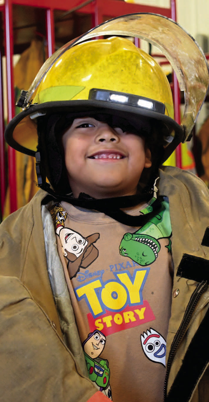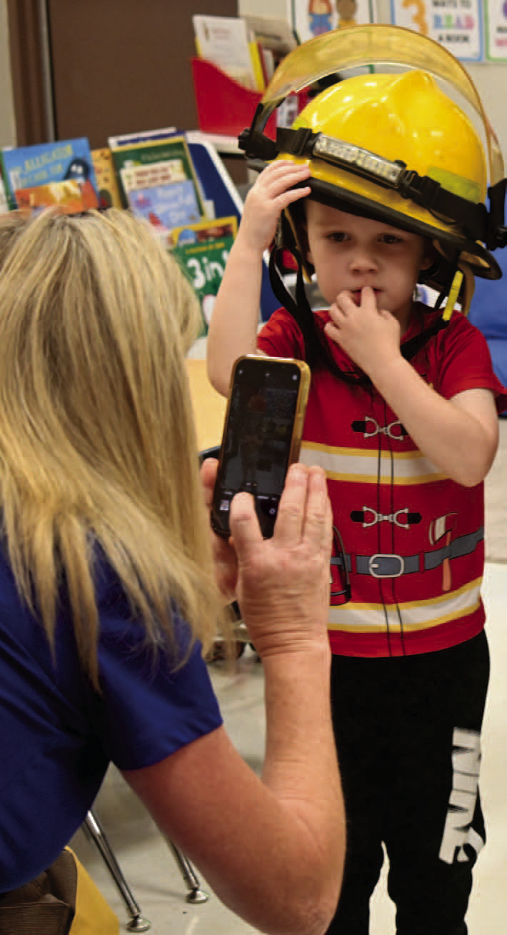 Holy Trinity and Hartington-Newcastle elementary students toured the Hartington Fire Hall Friday as part of National Fire Safety Week. (above) Fireman Jimmy Christensen helps Grace Rolfes try on a fire helmet and fire safety gear prior to their tour of the Fire Hall. (top, left) Hartington-Newcastle kindergartener Gael Chacon proudly displays the fire gear. (left) Holy Trinity Preschool paraprofessional Kristi Wintz takes a picture of Colson Potts as he tries on a fire helmet after listening to local firefighters talk about fire safety. Kellyn Dump | Cedar County News