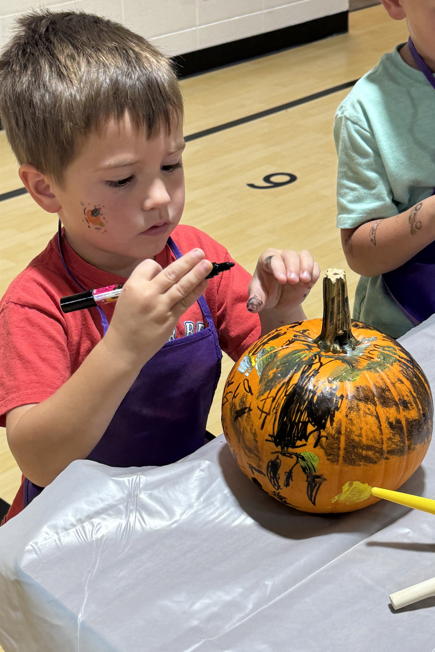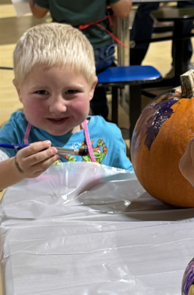 Cardinal Kids Learning Center students got ready for Halloween as they were able to paint pumpkins on Wednesday. Many parents also came to the classroom to help out with the fun activity. (above) Bodey Gall works on his pumpkin. (right) Wryn Gubbels take his time as he carefully colors on his pumpkin. Jackie Loberg | Randolph Times