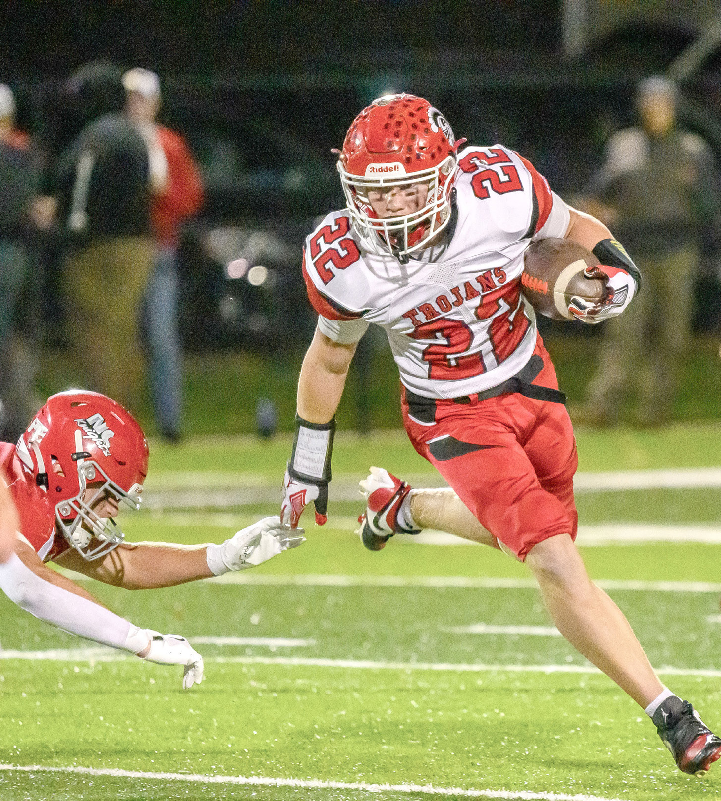 Cedar Catholic and Norfolk Catholic battled at Memorial Field in Norfolk Friday for the District title. Cooper Hochstein (above) pulls in a Grady Haberer pass for a touchdown as Norfolk Catholic’s Tristan Gudenkauf tries to defend him. Brady Hochstein (right) turns the corner upfield to escape some Norfolk Catholic defenders. The Trojans earned a hard-fought 27-7 victory to earn the title and complete the regular season at a perfect 9-0. This marks the Trojans third unbeaten regular season in school history. The Trojans also put together an undefeated season in 1992 and in 1975.