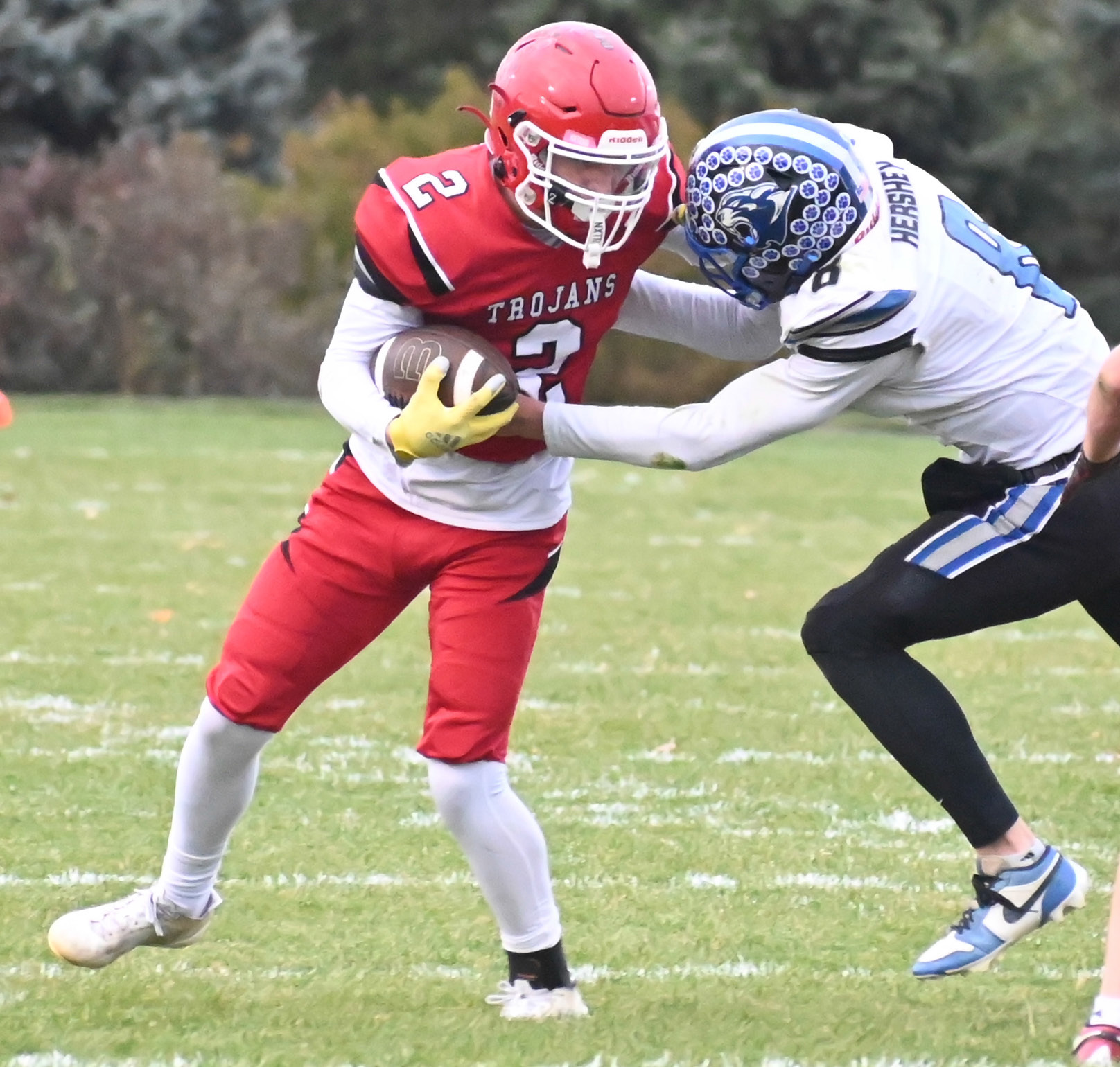 The Cedar Catholic Trojans hosted Hershey Friday in the first round of the playoffs. The Trojans’ showed their depth in the game as they got big performances from several athletes, including Booker Hochstein (top) and Hunter Bensen (right). Cedar defeated Hershey 48-0 in the contest and will now host Ord in Friday’s playoff quarterfinal game at Russ Hochstein Field.