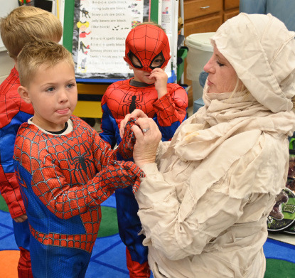 Kristi Wintz helps her grandson Wells Wintz and Grayson Newsam along with the other Spider-Men in the class get ready for their annual Halloween party at Holy Trinity Jr. Kindergarten.