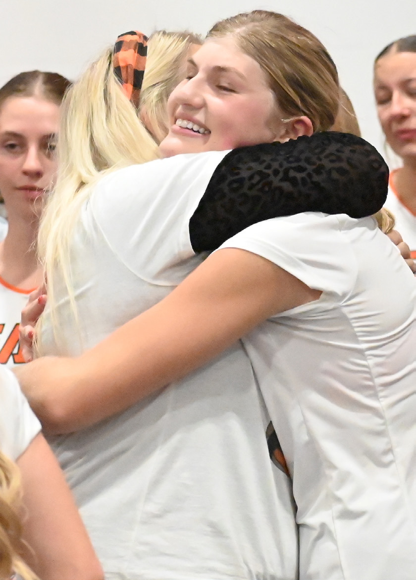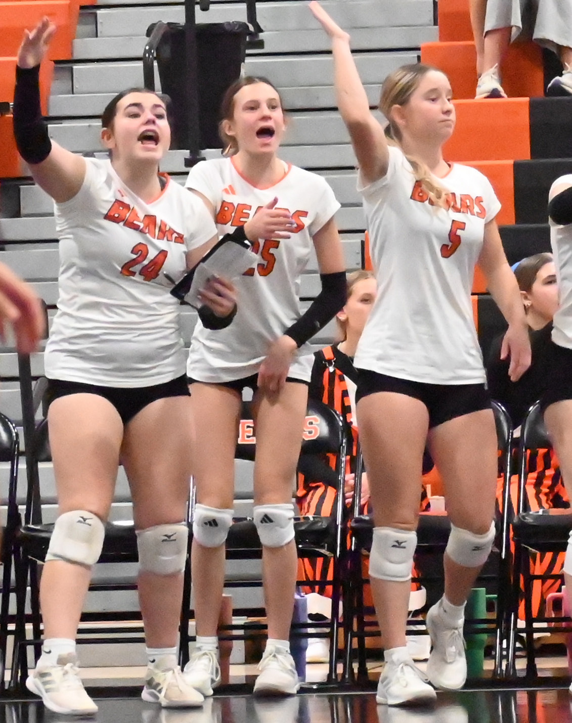 LCC coach Julie Kvols and the rest of the Lady Bear bench celebrate a point as they defeated Stanton Saturday in the District title game to advance to this week’s Class C2 State Tournament in Lincoln . The last time the Laurel volleyball girls made it to State was in 2002. Rob Dump | Laurel Advocate