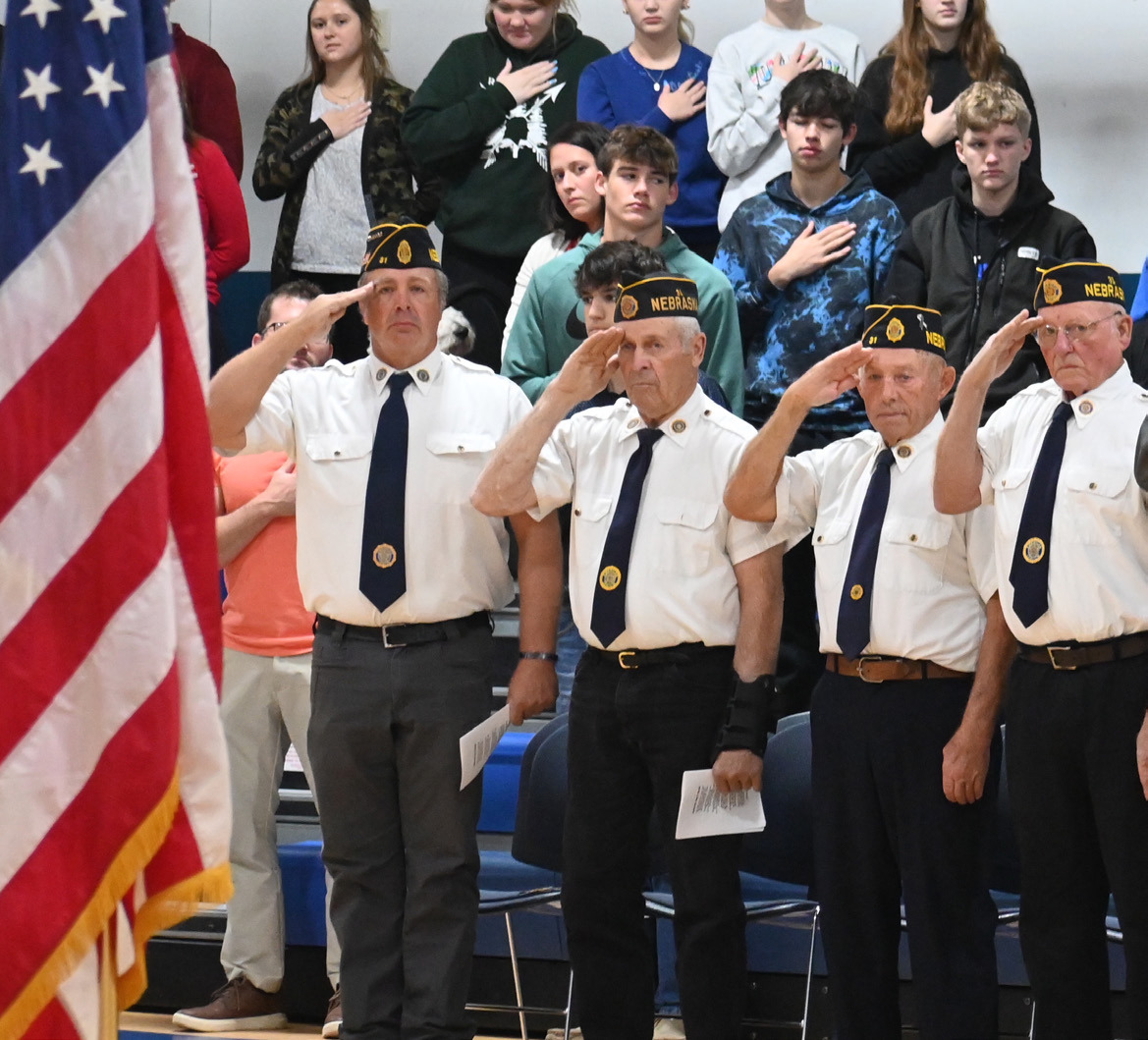 Wynot area veterans salute the flag as it is placed in the Wynot High School gym at the start of Tuesday's Veterans Day program. The program also featured musical selections from the 7-12 band, the K-1 choir, 2-4 choir, 5-8 choir and the 9-12 choir and speeches from several Wynot students. Supt. Paul Hans also made a special presentation honoring veteran Francis Uhing. Kellyn Dump | Cedar County News