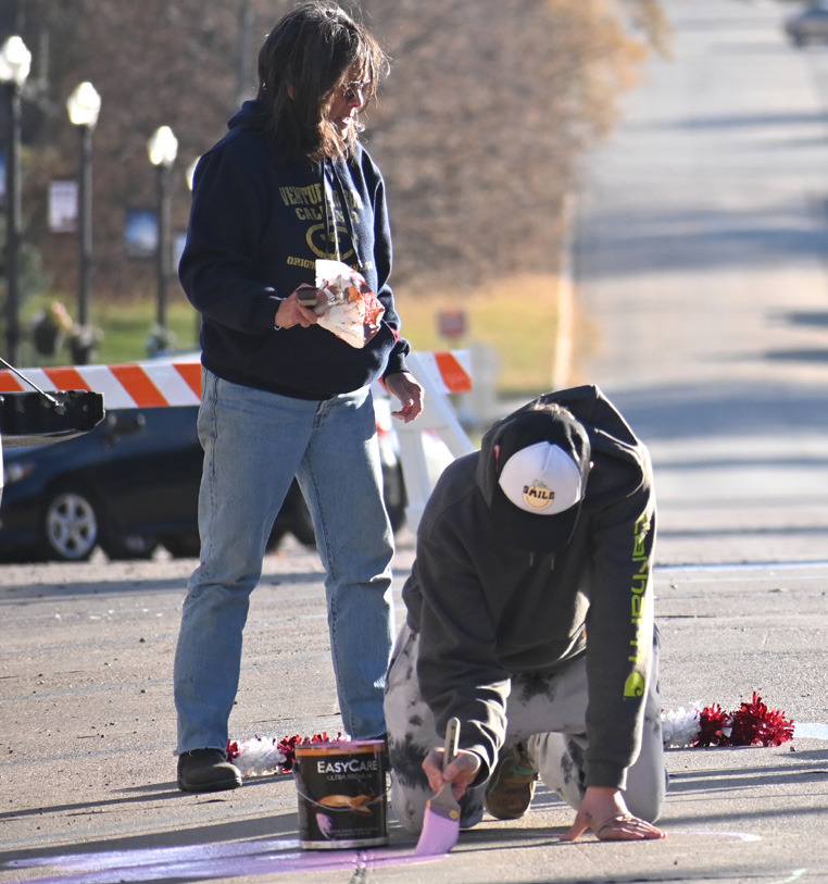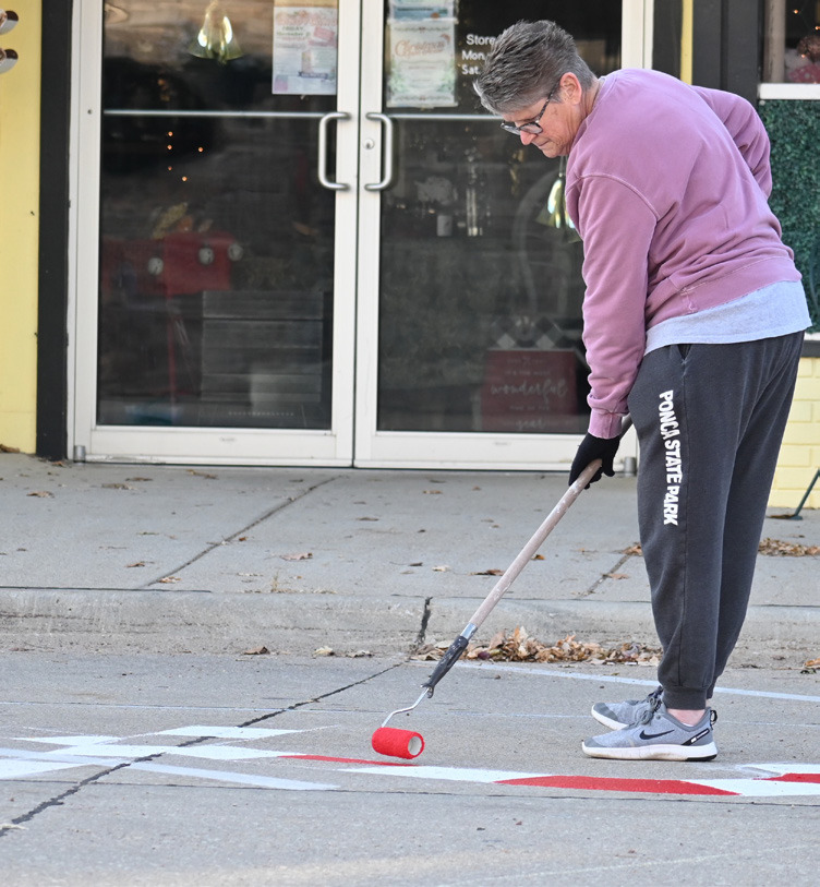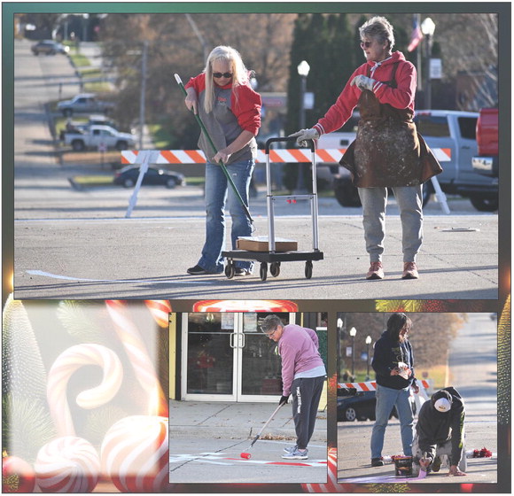 Hartington Chamber of Commerce members, led by Angie Peitz, hit the streets Sunday night to lay down some colorful Candyland artwork in preparation for Friday night's annual Hartington Candlelight Christmas celebration. Those helping included: (top) Angie Peitz and Lisa Dendinger, (right) Tammi Tanderup (far right) Karen Haberer gets ready to assist Bradley Forinash with the painting.