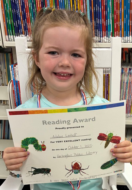 HARTINGTON — Adaline Lenhoff, daughter of Nick and Lindsey Lenhoff, is the winner of the Hartington Public Library “1000 Books Before Kindergarten” award. Adaline received a medal, a certificate, her final prize and a free book from the Hartington library. Adaline will be entering Kindergarten at Hartington-Newcastle in the fall of 2027.