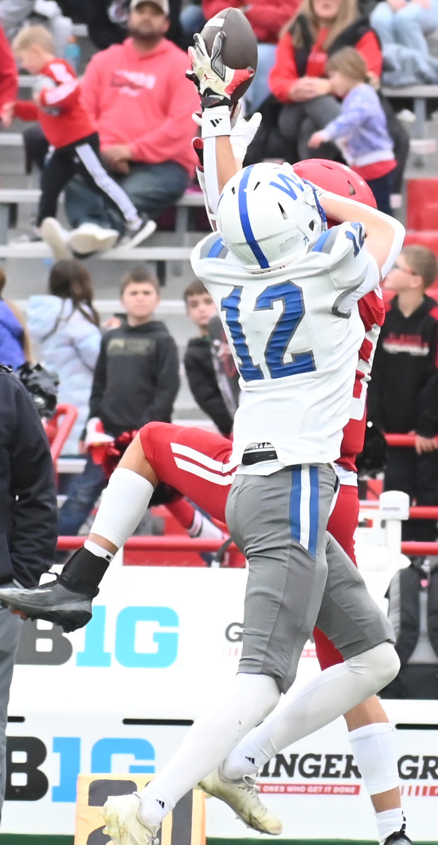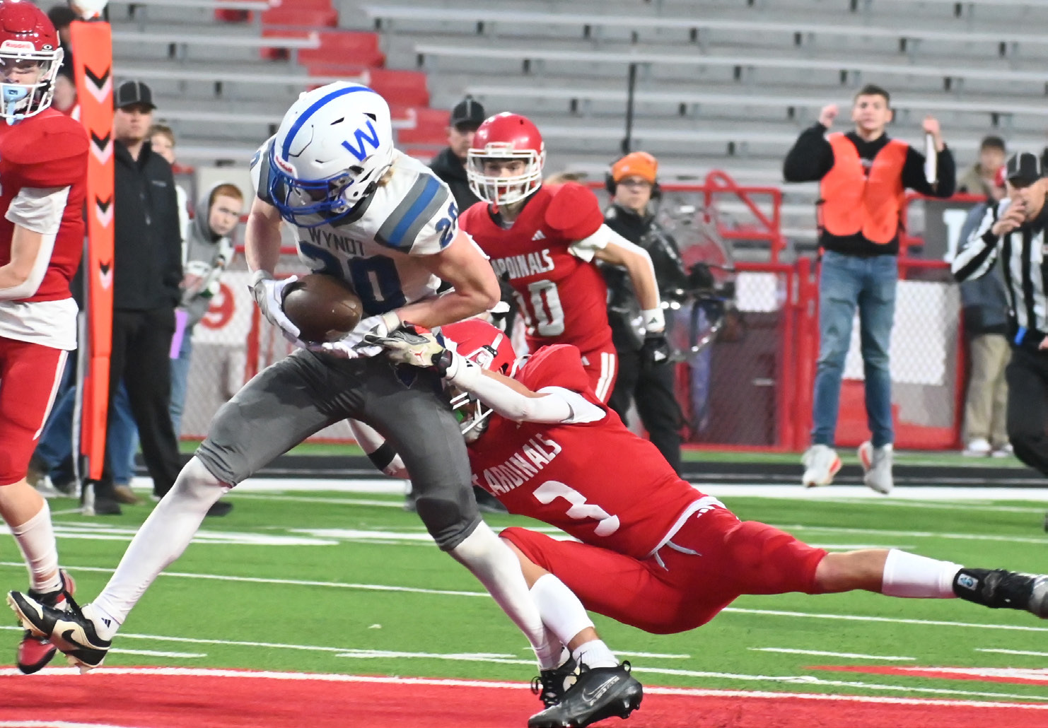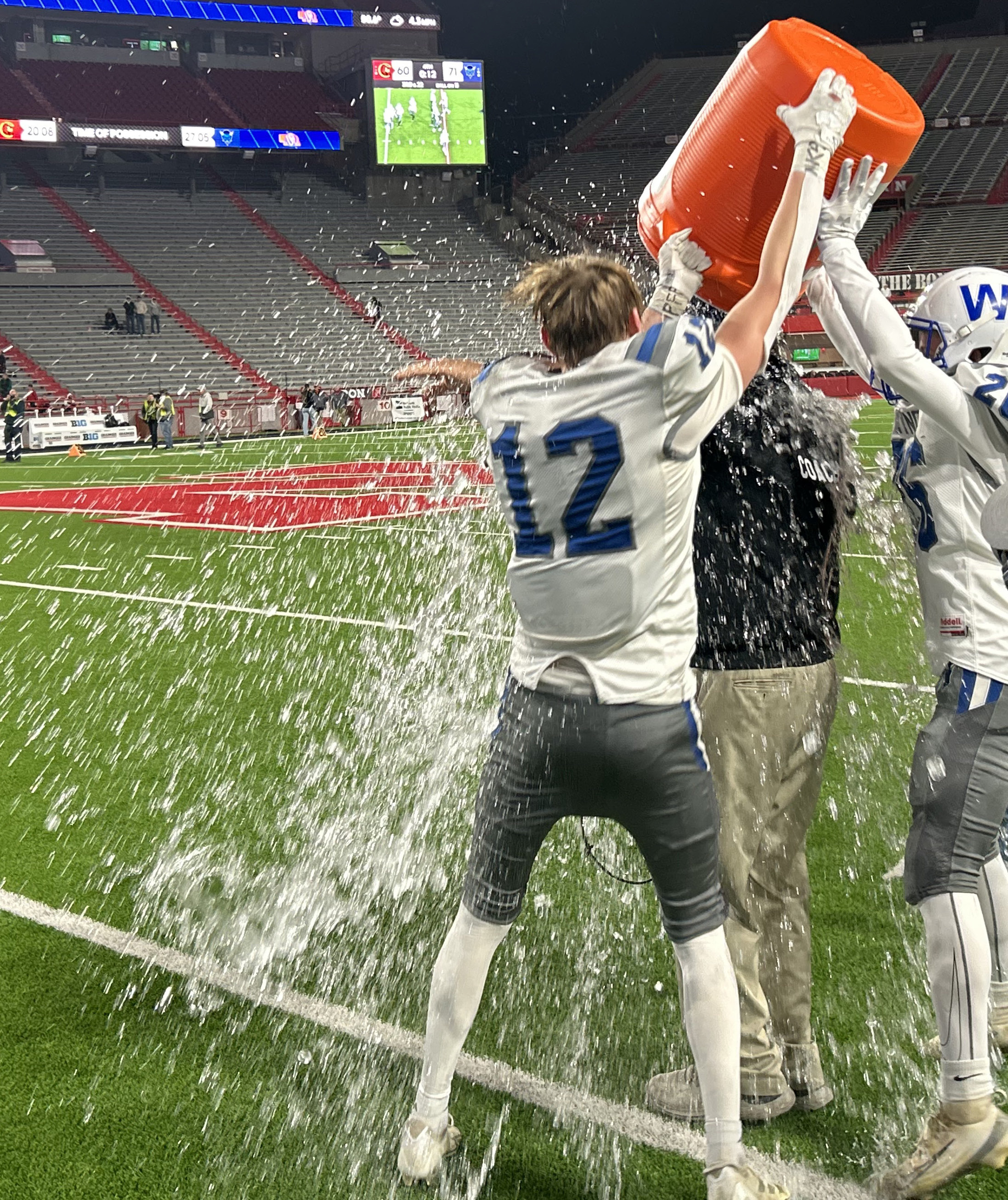 The Wynot Blue Devils survived a 71-60 Class C2 State champion game shootout with O’Neill St. Mary’s Monday to claim the State title. (top) Wynot quarterback Devin Brummels tries to escape the tackle of O’Neill St. Mary’s Drake Berg. (above) Killian Steinhaus goes for the interception attempt. (middle) Kotner Koch breaks Ben Barlow’s tackle attempt as he crosses midfield at Memorial Stadium. (right) Coach Steve Heimes gets a Gatorade bath from Steinhaus and Kameron Koch as the clock ticks down with the Blue Devils ahead by 11 points. See https://cedarcountynews. zenfolio. com/ p904665160 for more photos.