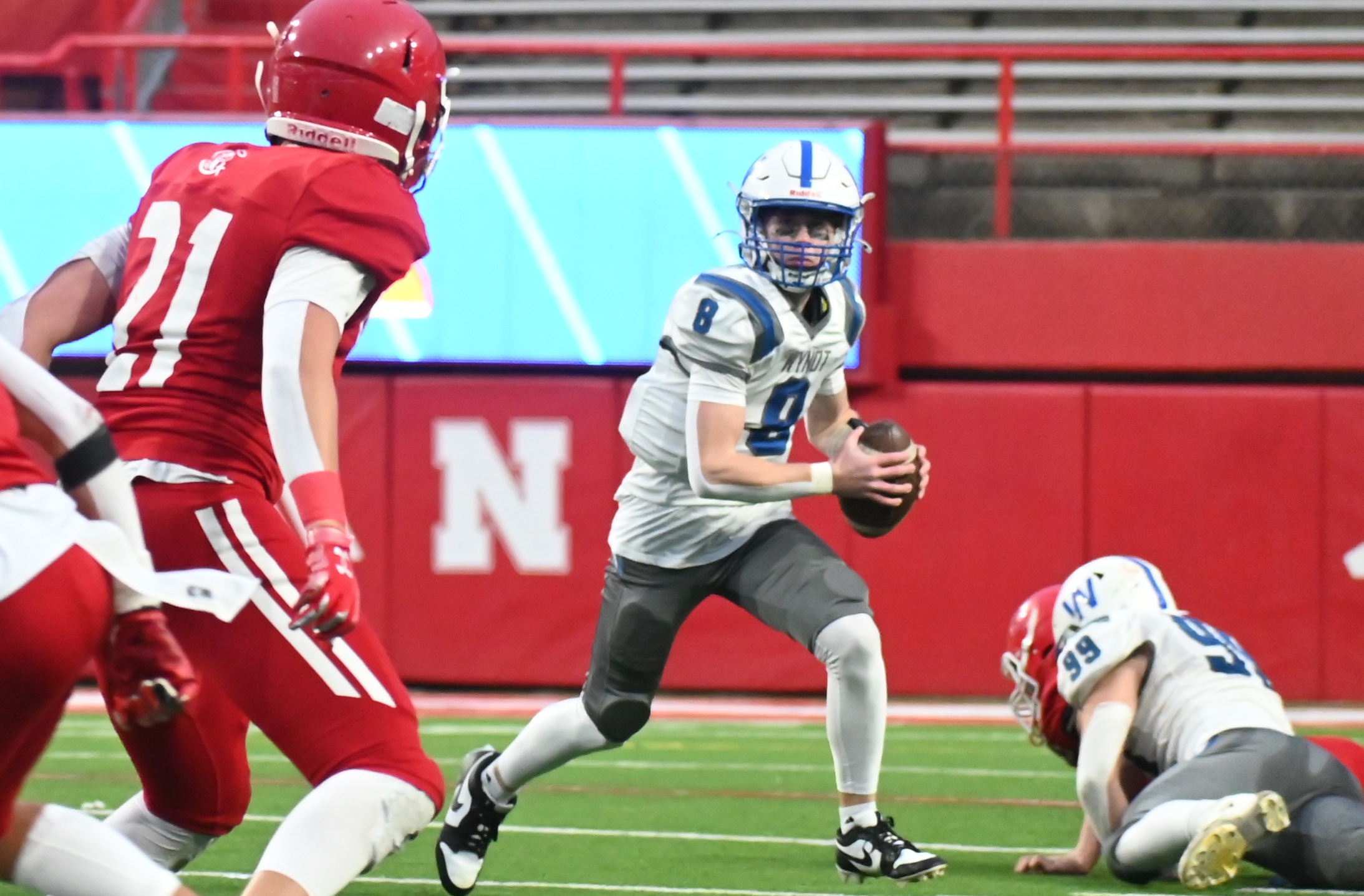 Wynot’s Devin Brummer scrambles out of the pocket as he looks for an open receiver.