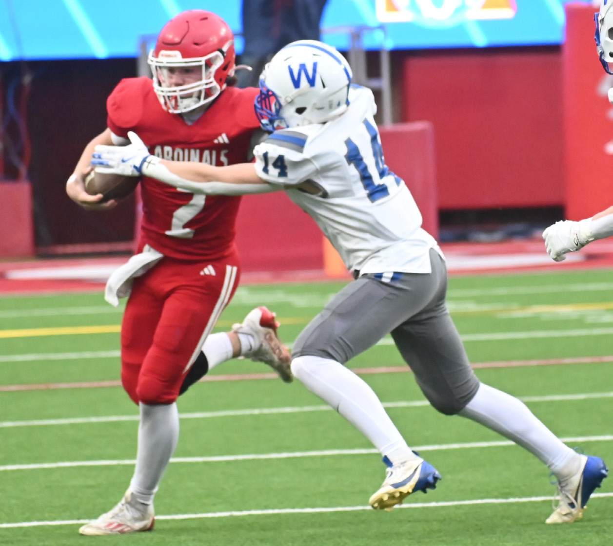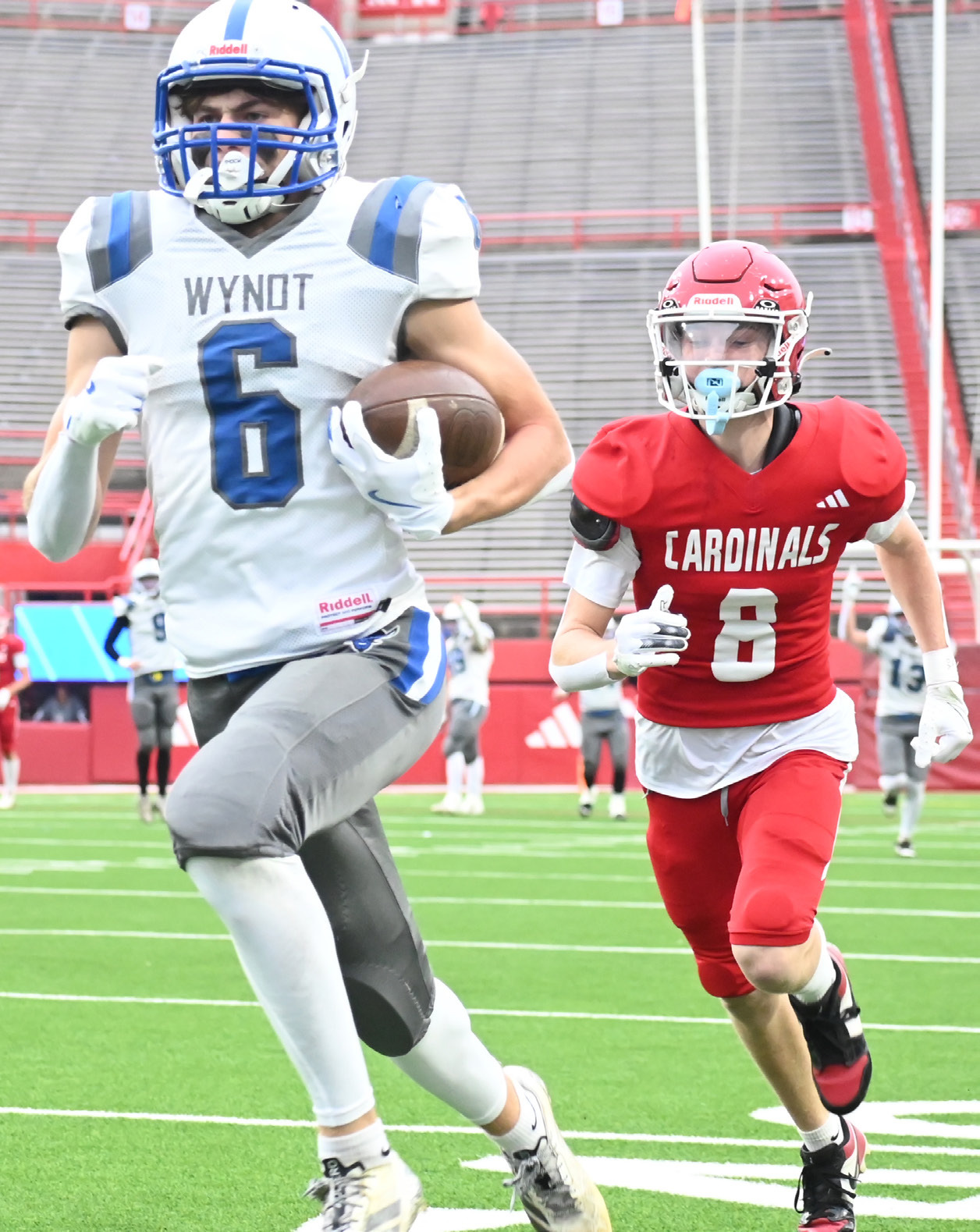 Wynot’s Kotner Koch tries to break free from a Cardinal defender on a big gainer during second-quarter action at Memorial Stadium.
