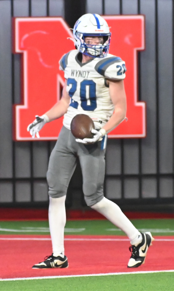 Wynot’s Kotner Koch looks for a ref to hand the ball off to after scoring one of his touchdowns Monday afternoon.
