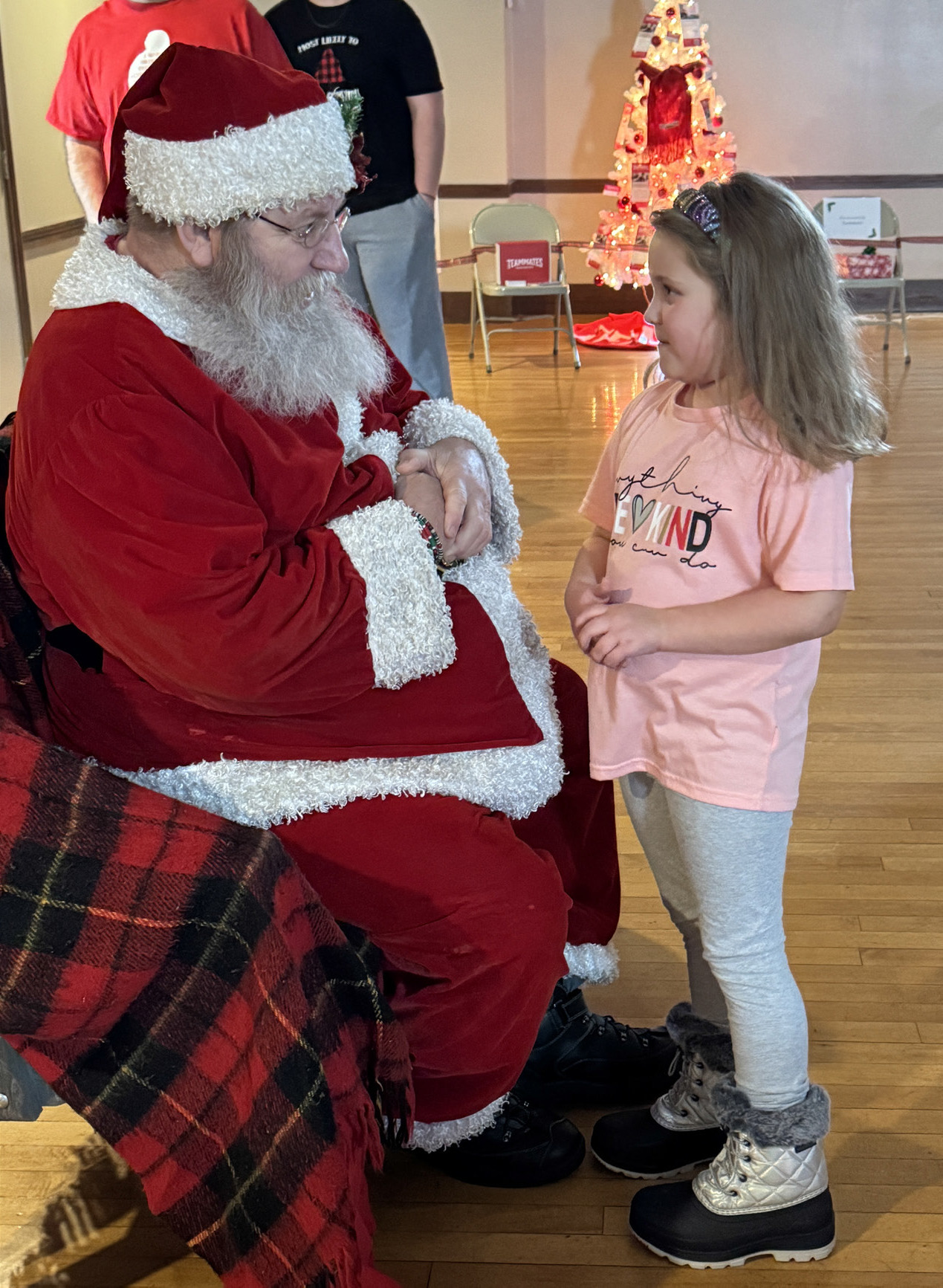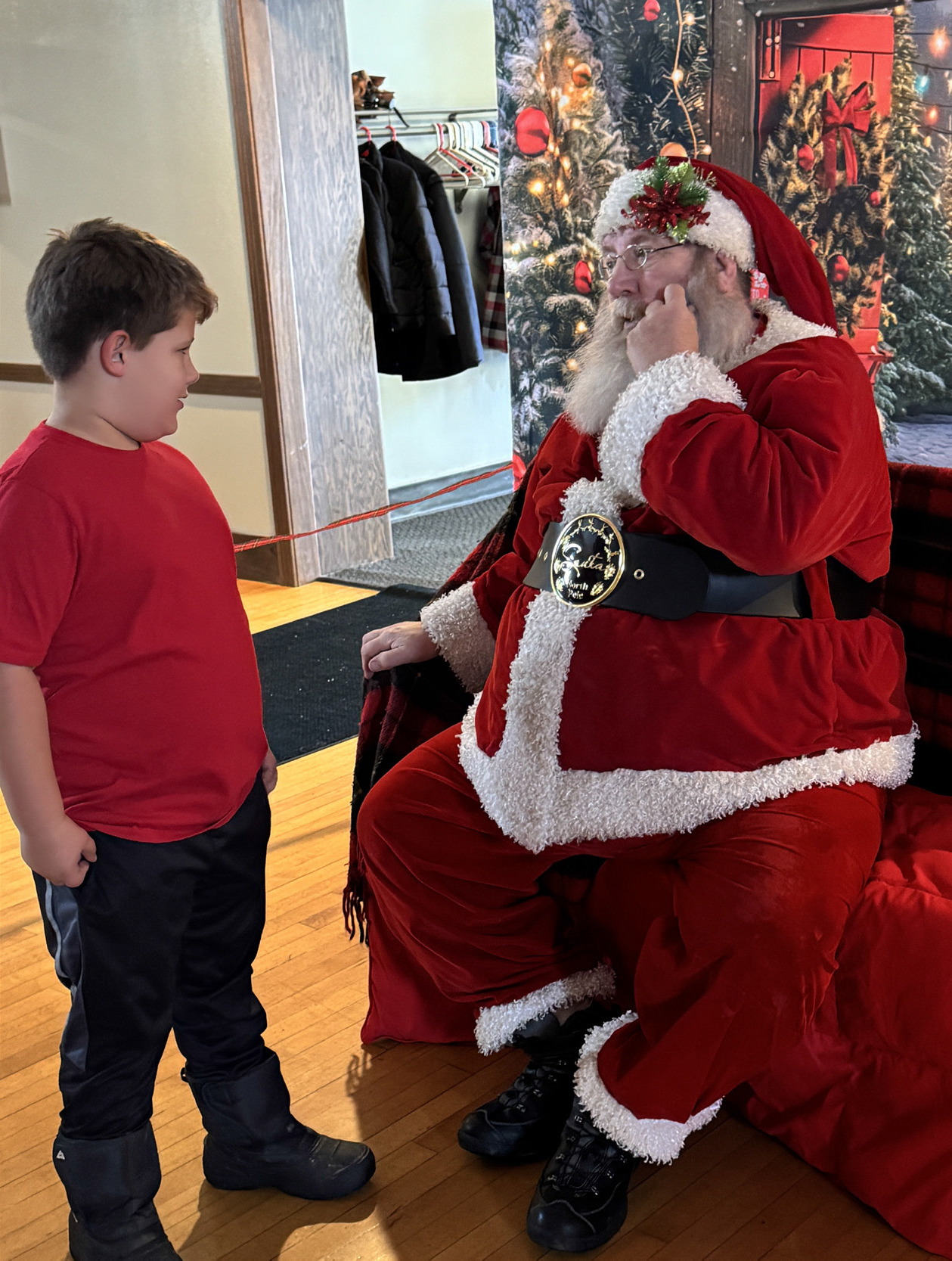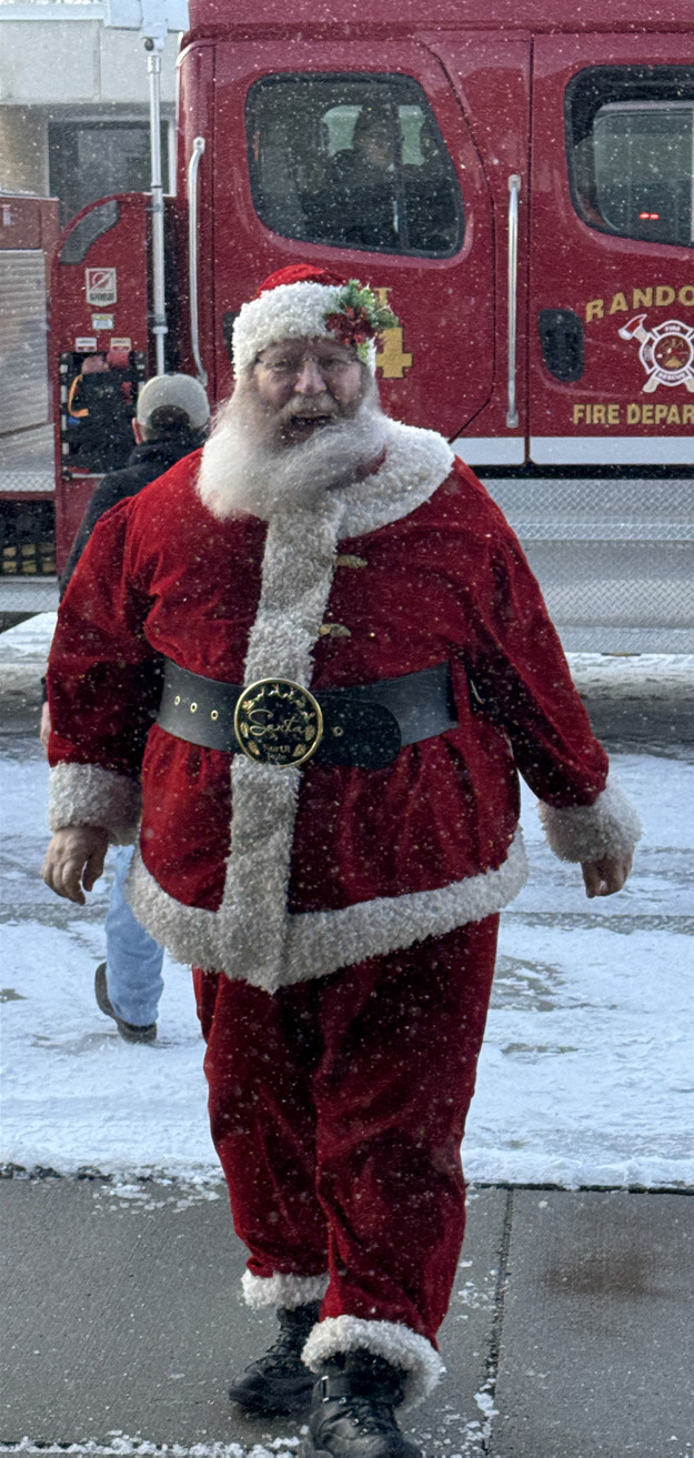 Santa arrived in Randolph to start out the Holiday Season at the ROAR Merry and Bright Showcase of Holiday Trees event. Anna Schutt (l) dressed for the occasion in a red velvet dress and told Santa all of the things she wanted for Christmas, while Christian, Archer and Knox Conroy (above) joined in the fun. Briar Van Brocklin (middle left) tells Santa what she would like for Christmas this year. Bodey Gall (middle) enjoyed his conversation with Santa, but Beck Strathman (middle right) was maybe not as enthusiastic. Santa arrived at the event (bottom) courtesy of the Randolph Fire Department. Photos by Jackie Loberg