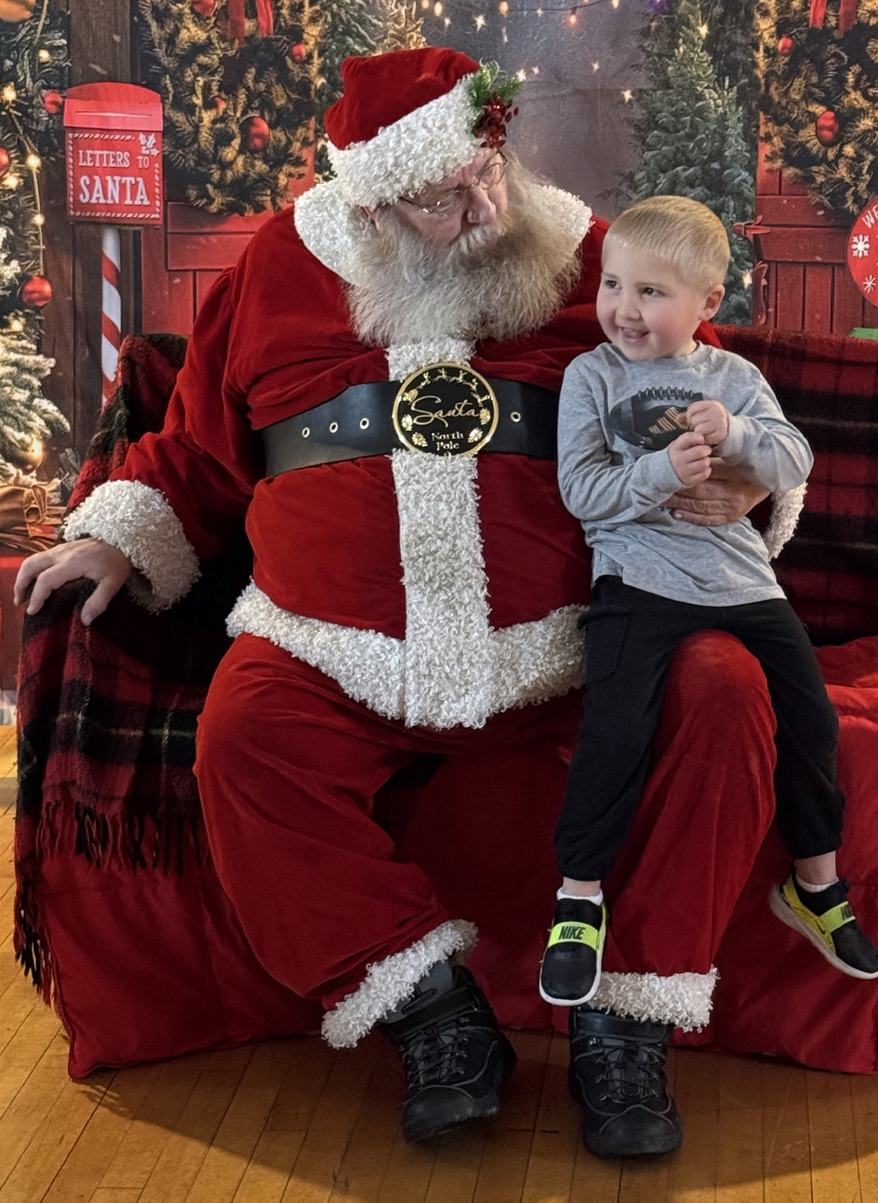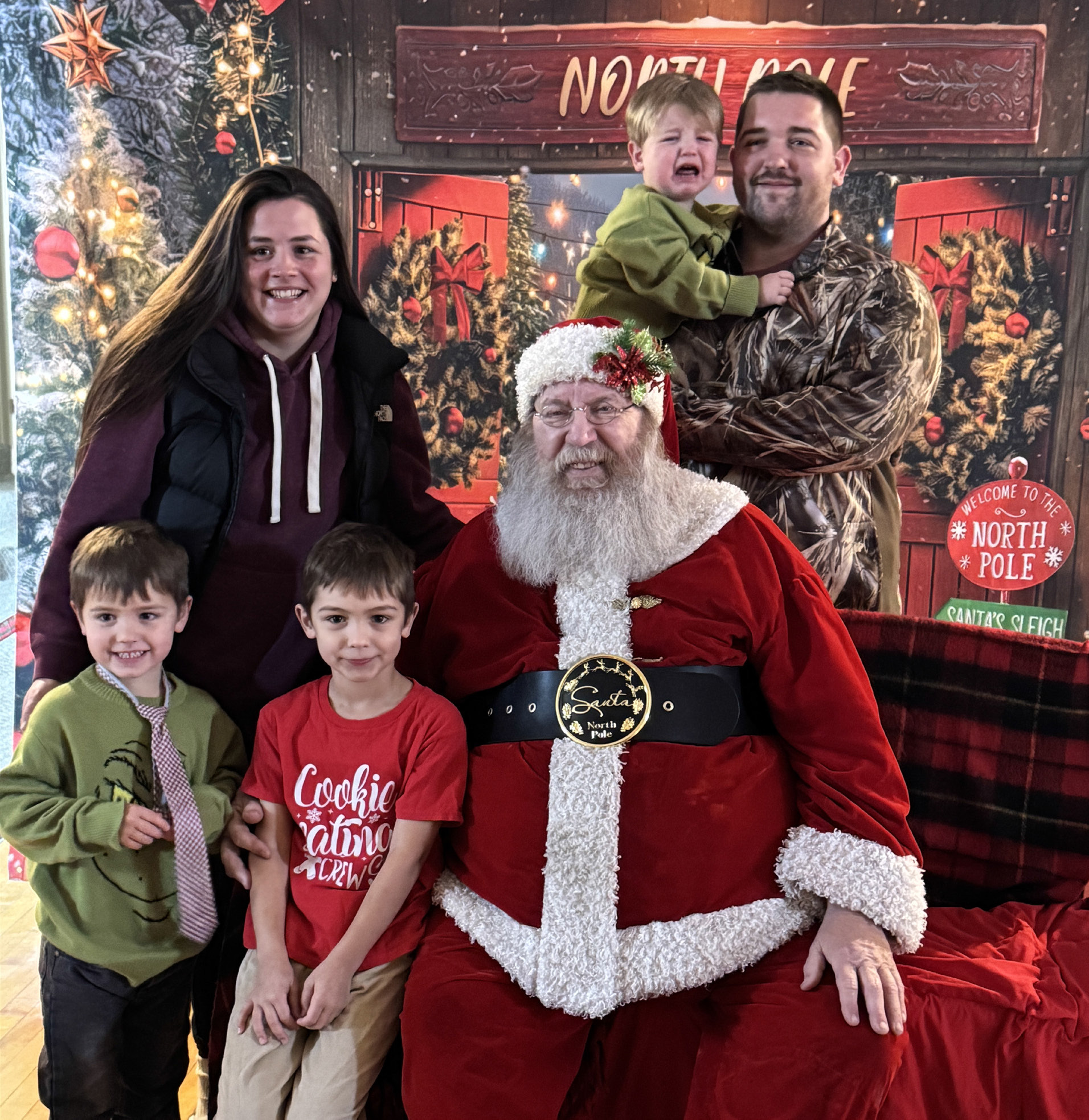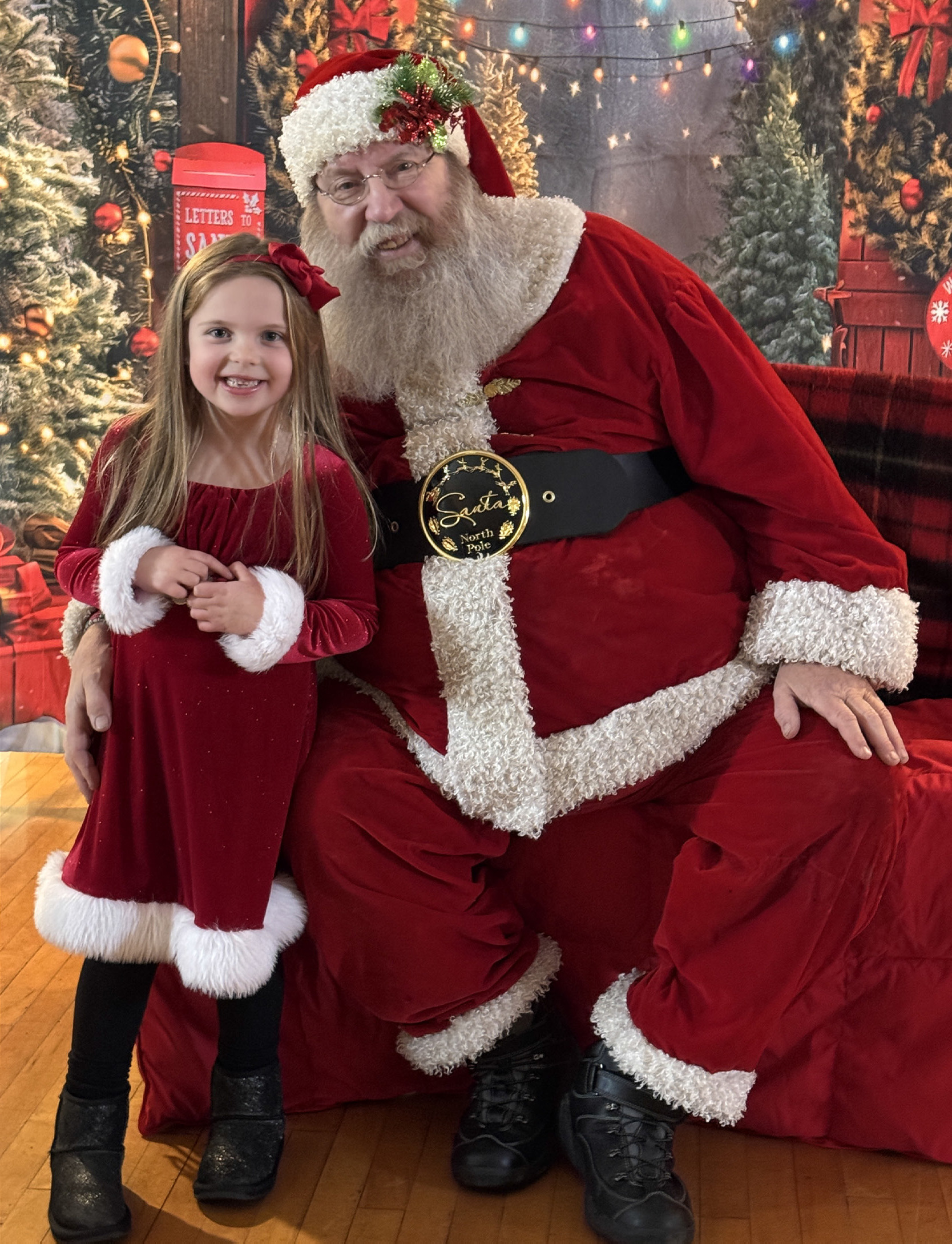 Santa arrived in Randolph to start out the Holiday Season at the ROAR Merry and Bright Showcase of Holiday Trees event. Anna Schutt (l) dressed for the occasion in a red velvet dress and told Santa all of the things she wanted for Christmas, while Christian, Archer and Knox Conroy (above) joined in the fun. Briar Van Brocklin (middle left) tells Santa what she would like for Christmas this year. Bodey Gall (middle) enjoyed his conversation with Santa, but Beck Strathman (middle right) was maybe not as enthusiastic. Santa arrived at the event (bottom) courtesy of the Randolph Fire Department. Photos by Jackie Loberg