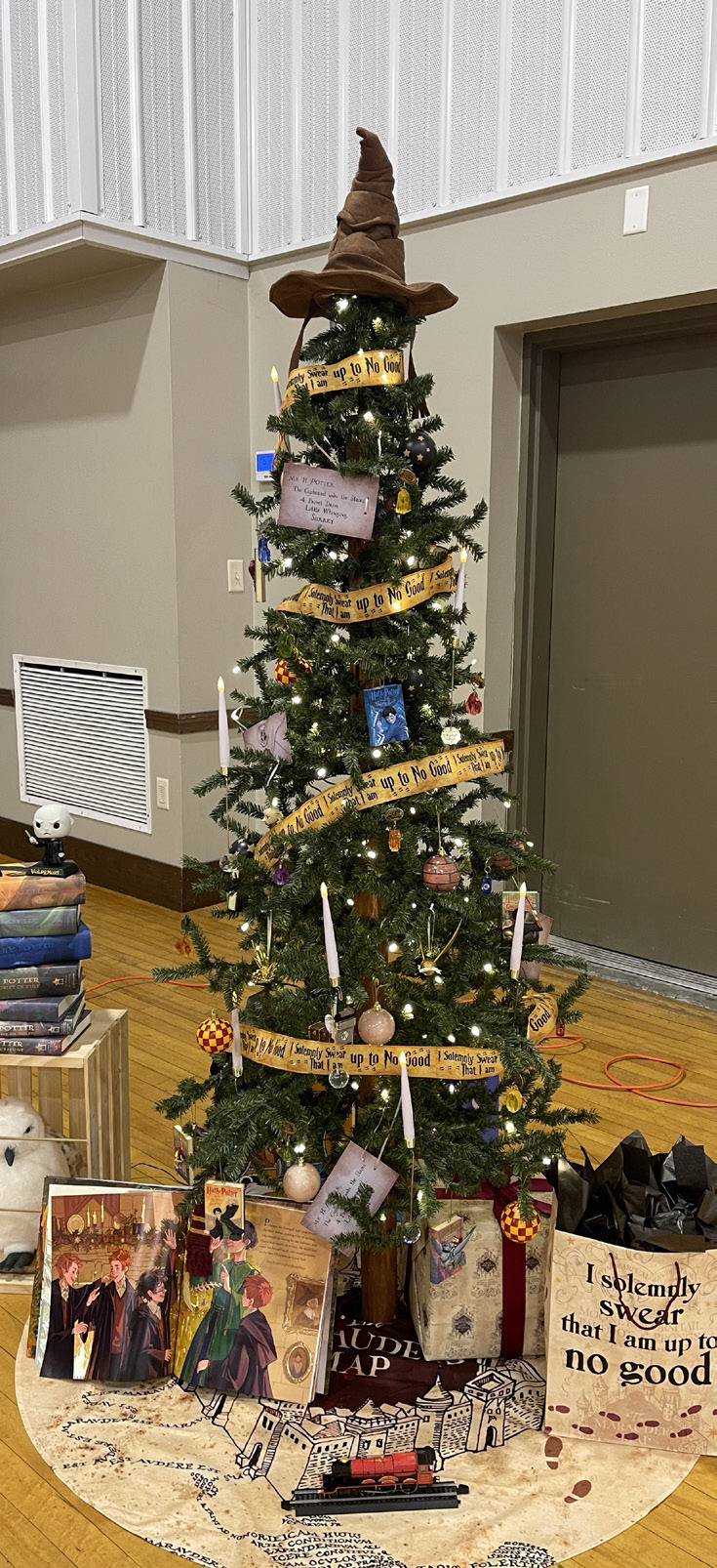 Last week’s ROAR Merry and Bright Showcase of Holiday Trees event was a huge success. (above) Nicole Patent helps flip the switch to light the big downtown Christmas tree. (top, right) The Randolph Family Practice tree. (far right) The Cbees Honey Tree earned top honors. (right) Jeri Schmit’s Harry Potter tree took second.