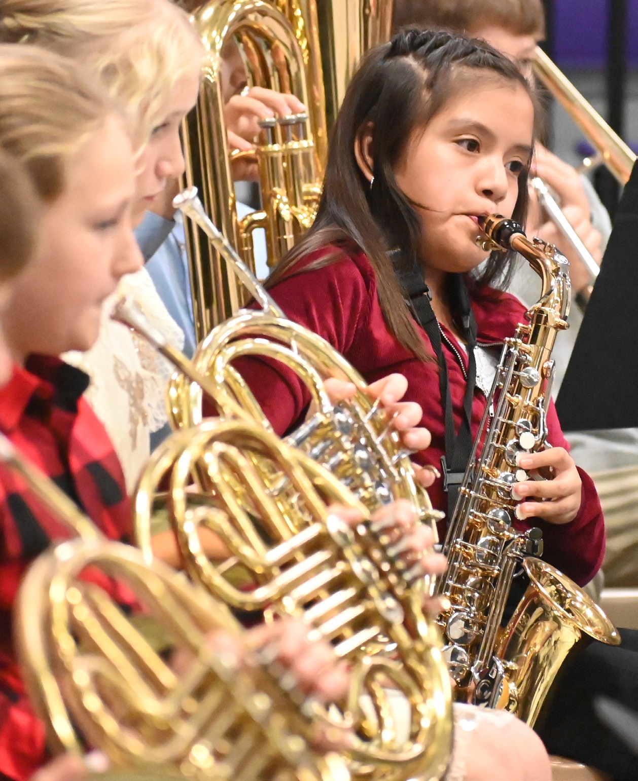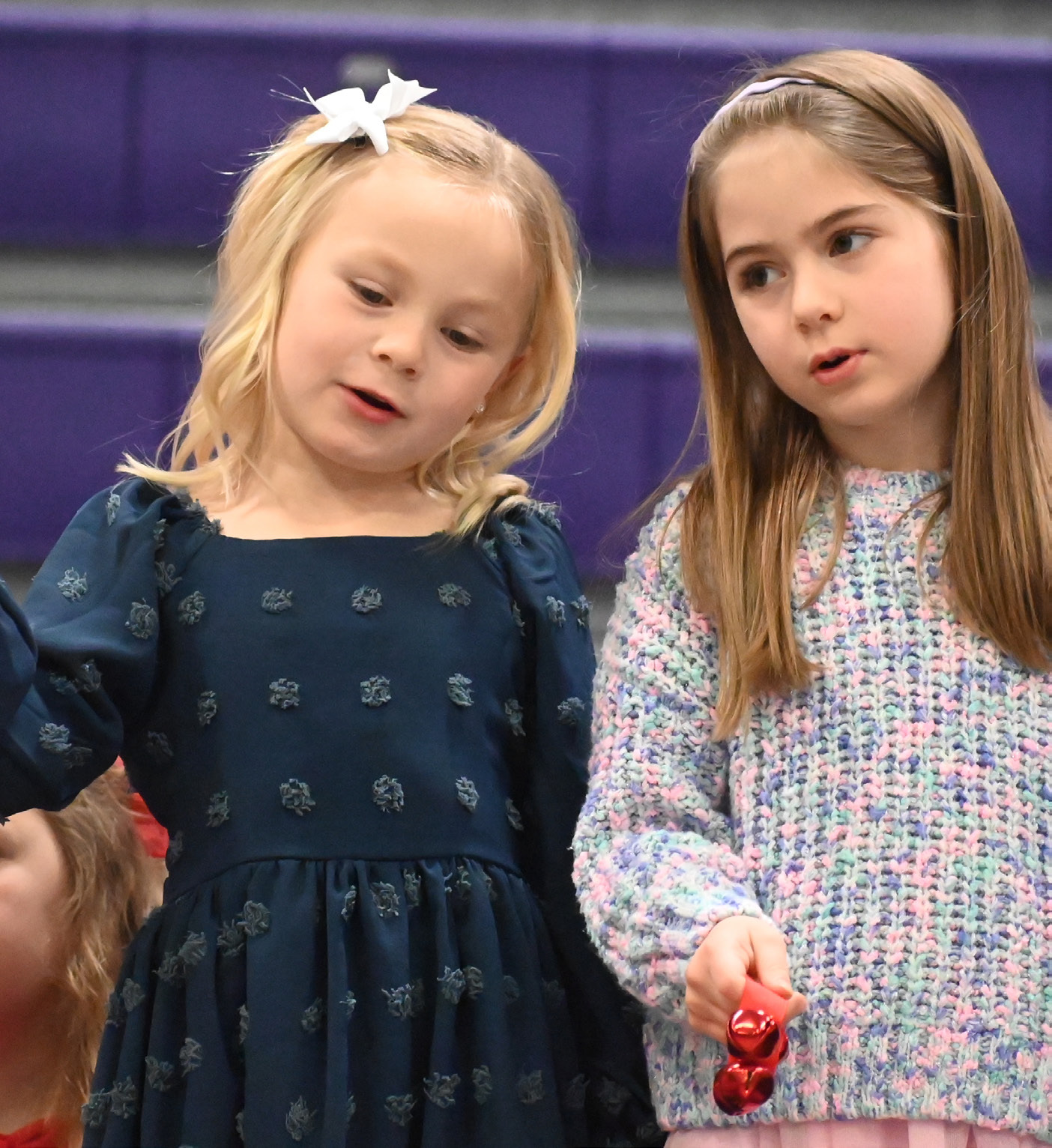 Hartington-Newcastle Elementary School students got the Holiday season started off right with their Monday night Christmas concert in front of a standing-room only crowd at the HNS Gym. (Left, back row) Marvin Hawkins Jr., Blakelee Fleming, (front row) Grace Rolfes and Jordan ZanSurksum help their kindergarten classmates perform the song 'Reindeer Parade.' (Bottom left) Zada Kalin and Kenna Lammers sing 'I'm a Little Snowflake.' (Bottom right) KC Hergott, Paizleigh Eickhoff and Hailey Santiago help the fourth and fifth grade band perform 'Up on the Housetop.'