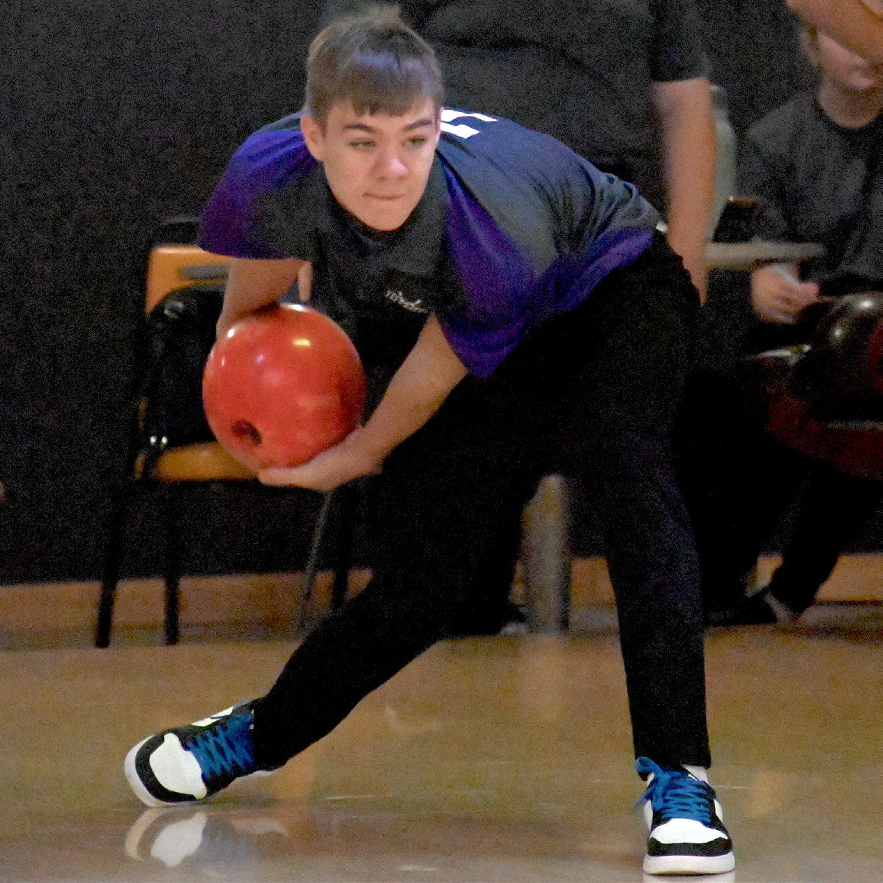Kayne Gratzfeld rolls the ball down the alley at Broadway Lanes as the Hartington- Newcastle bowling team came from behind to get past Plainview Dec. 6. After the Wildcats rolled their first game they trailed the Pirates 6.5 to 1.5 in the match but HNS came back in the second round of individual bowling to take an 8.5 to 7.5 lead into the best-of-three baker’s match. The ‘Cats won the first game of the baker’s 136-108 but lost the second round of the match 144-104. HNS closed out the last game 170-92 to earn the five baker’s points for winning the baker’s portion of the day and take the overall match 13.5 to 7.5. In the first qualifying match Memphis Ulrich rolled a 144, Nate Arens scored a 150, Aiden Walter tossed a 120 and Maddox Ulrich and Gabe Sovereign combined for an 89 and Kayne Gratzfeld rolled a 132. In the second individual games Memphis Ulrich and Arens posted identical 124’s, Walter and Braeden Gubbels combined for a 116, Maddox Ulrich scored a 181 and Gratzfeld scattered the pins for a 173 to get the lead back for the ‘Cats. Kellyn Dump | Cedar County News