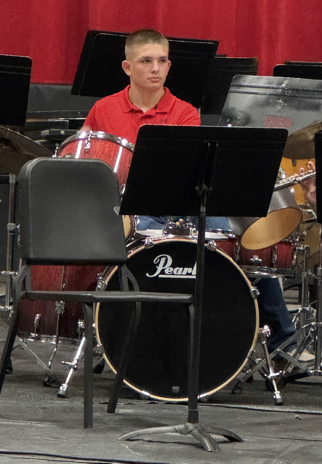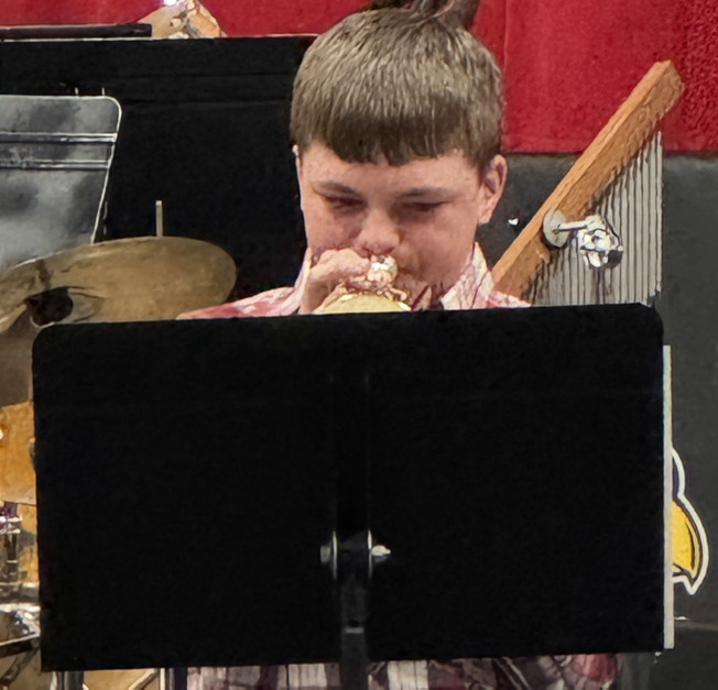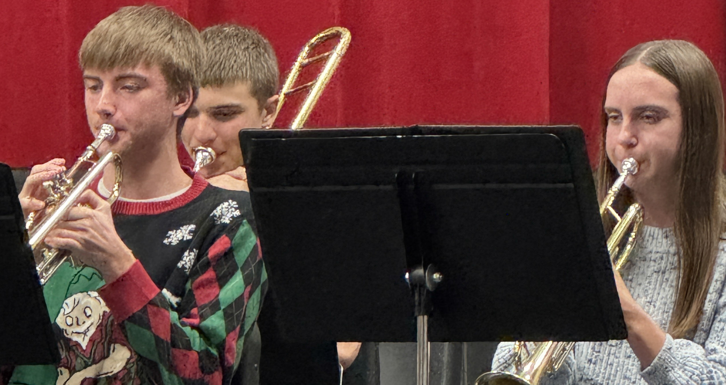 The Randolph Jr.-Sr. High School students put on their annual Christmas concert Monday night. (top) Xavia Engle and Lillian Edberg were the junior high vocalists. (above) Robby Dorcey helped his Jr. High School band classmates hit all the right notes. (middle) Jr. High school drummer Adam Miller keeps the beat. (bottom) Trumpet players Ryan Engel and Emily Gilliland helped the band play several Holiday favorites.