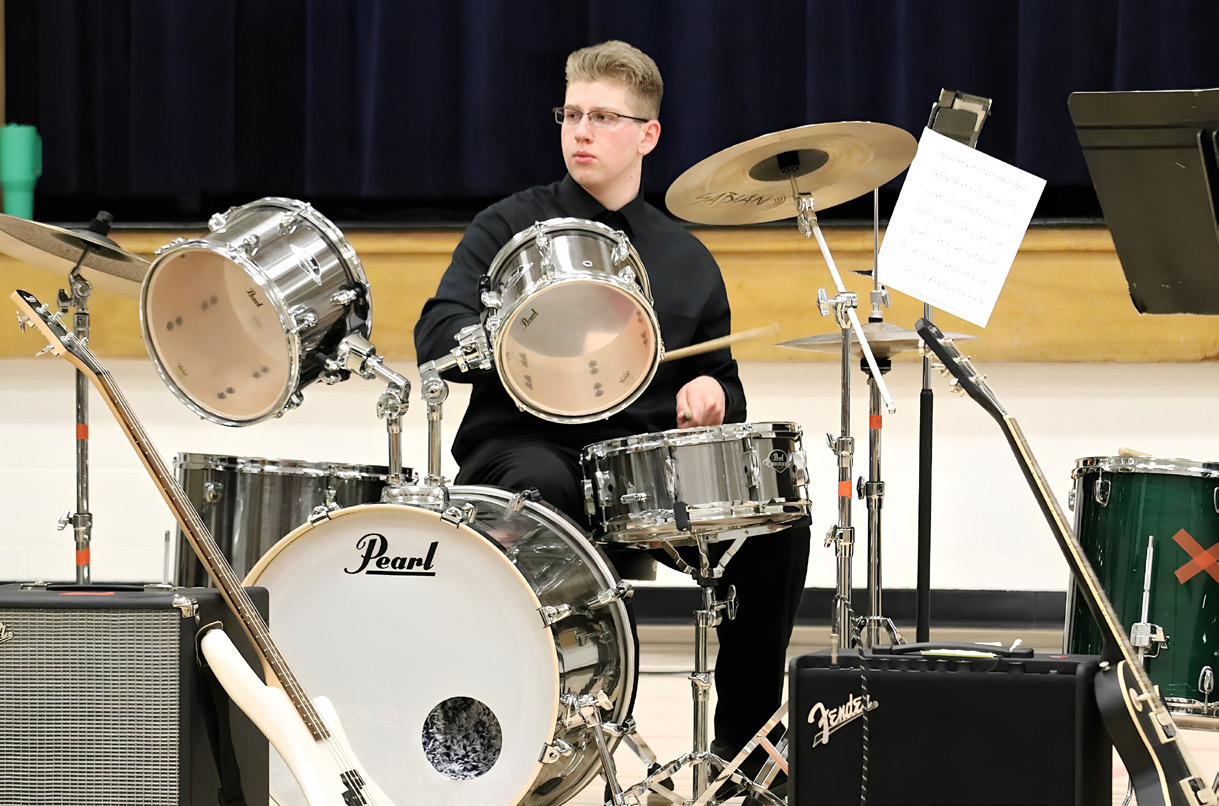 LCC held its annual High School Christmas concert Monday night in the school gym. The students dressed in their festive best to help them put on a show with their vocal and musical talents. (top photo) (Back row) Noah Larson, Jaylen Carpenter, Trystan Sims, (front row) Ava Reifenrath, Lisa Jackson and Kassidy Koch perform with their classmates. (left) Derek Nelson keeps the beat for the band.