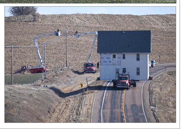Highway 12 was blocked off for several hours Thursday morning and early afternoon as crews worked to help Luke Schmitz move the old Sacred Heart Catholic Church rectory from its foundation next to the church in Wynot to its new home in Bow Valley. A crew from Cedar Knox Public Power District, as well as Nebraska State Patrol Troopers, Cedar County Sheriff’s Department deputies and Cedar County Road Department employees all got involved in the project. Before the house could be moved, Schmitz spent several weeks working inside of it preparing it ready for the move.