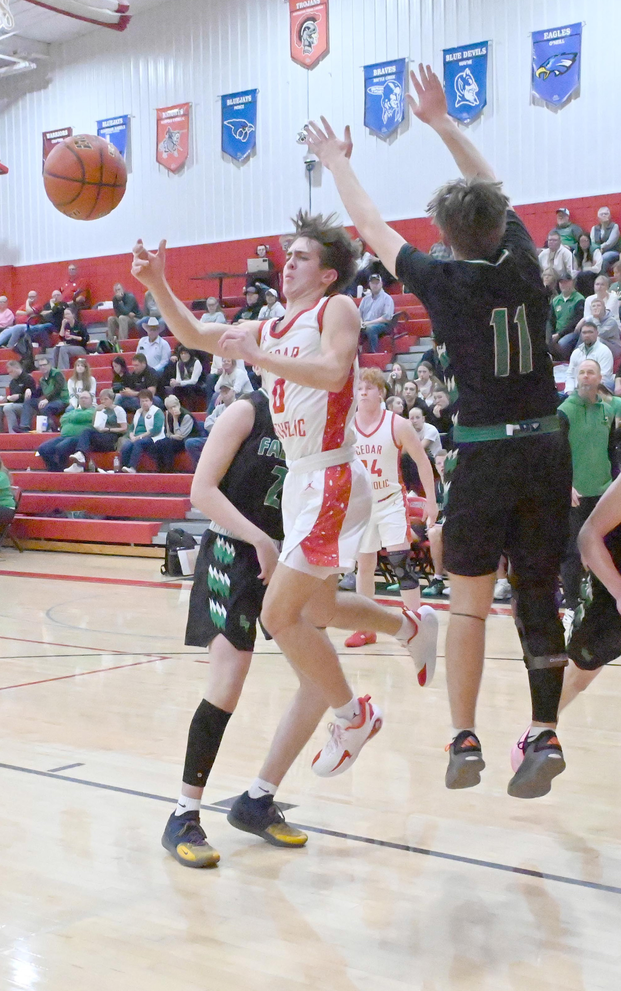 Cedar Catholic’s Mason Baller lips the ball to a teammate to avoid the Elkhorn Valley’s defensive pressure during action here last week. Kellyn Dump | Cedar County News