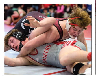 Cedar Catholic’s Brady Hochstein works to get Valentine’s Parker Chavez onto his back during semifinal round action Saturday in Madison. Kellyn Dump | Cedar County News