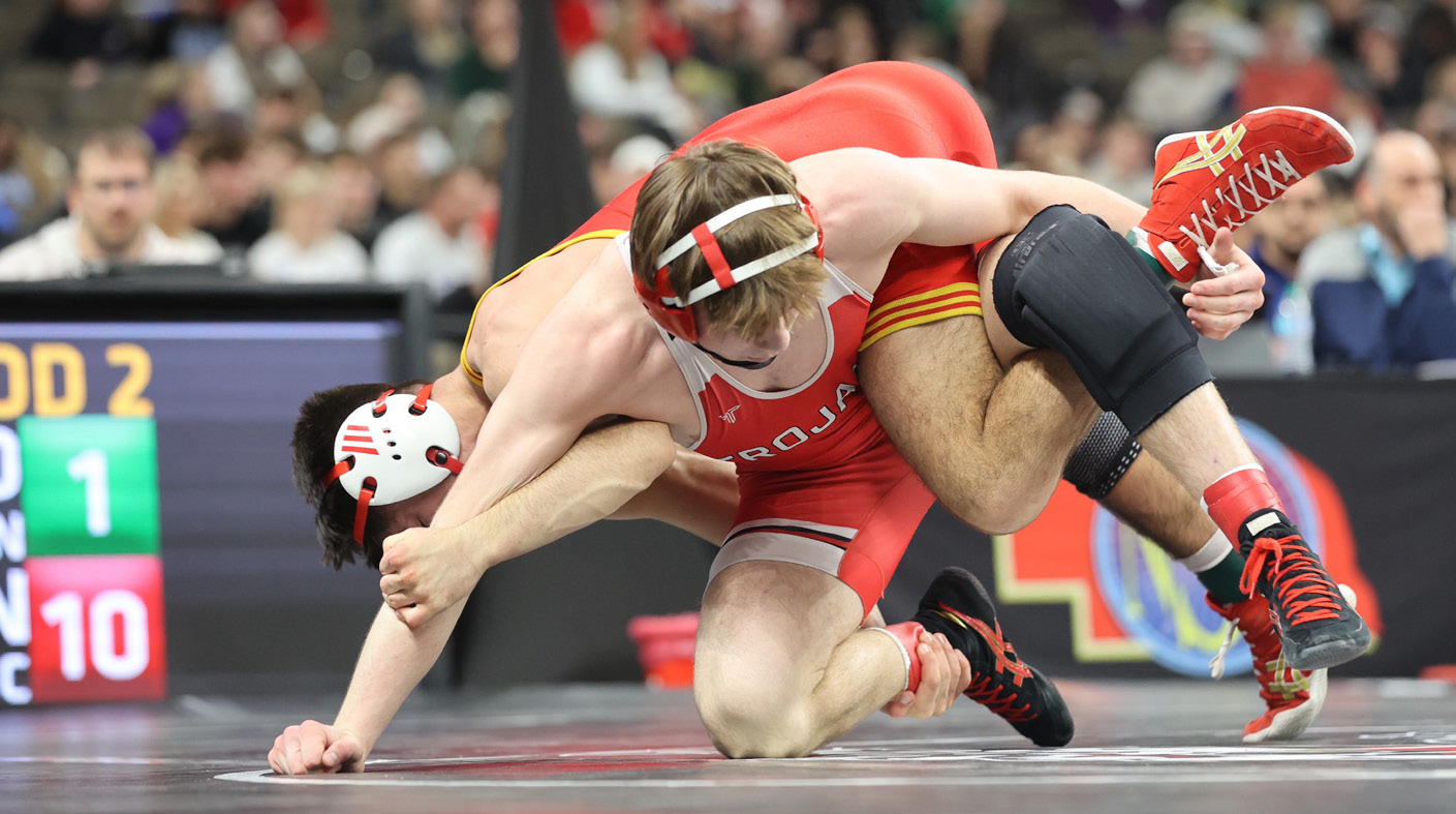 Cedar Catholic’s Bodie Hochstein (above) tries to keep Cozad’s Drake Hasbrouck from escaping during their State title match Saturday afternoon in the CHI Center in Omaha. Hasbrouck eventually managed to gain control of the match, defeating Hochstein 10-4 for the gold medal. (left) Easton Hochstein fights for control in his State title match with Bishop Neumann’s Landon Sund. He was able to earn the 15-2 major decision, making him the first two-time State champion in Cedar Catholic wrestling history. Jeremy Buss | Cedar County News
