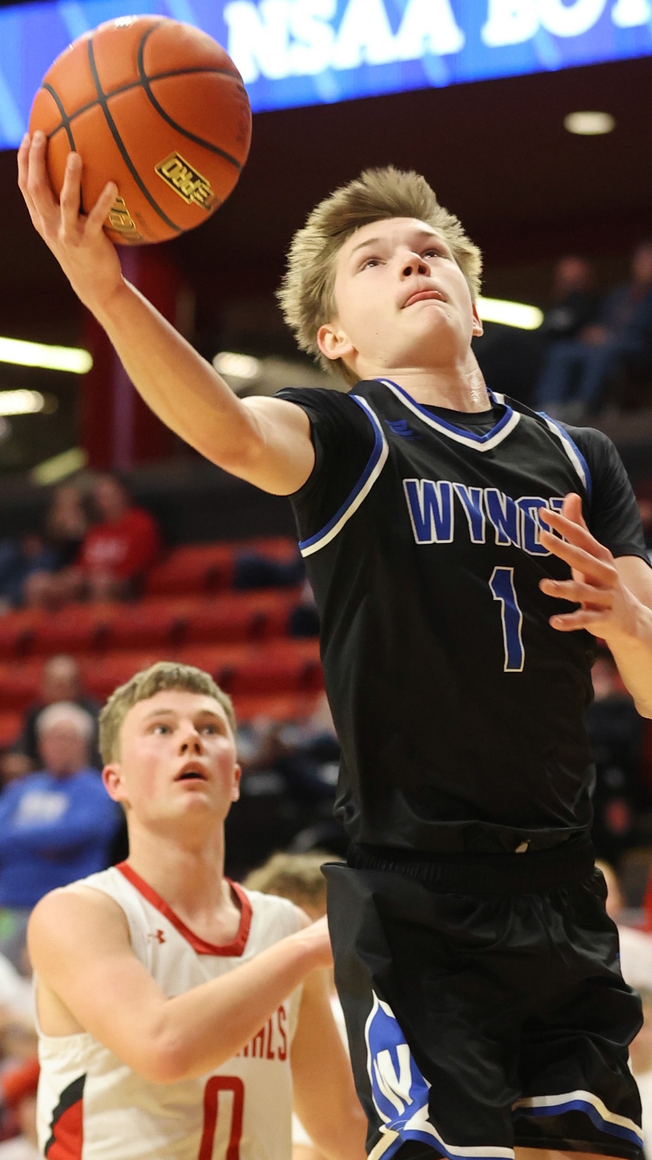 The Wynot Blue Devils took on the high flying Cardinals of O’Neill St. Marys in last week’s State Tourney opener at the Bob Devaney Sports Center in Lincoln. Justin Heimes (left) jumps stops on a fast break to let the Cardinal defender fly past him during first half action. Killian Steinhaus (above) finds the open lane as he drives to the basket against the Cards. St. Mary’s went into the tournament rated first in the state in most polls. After beating the Devils, they lost in semifinal action to Humphrey Archangels and ended up settling for third-place honors.
