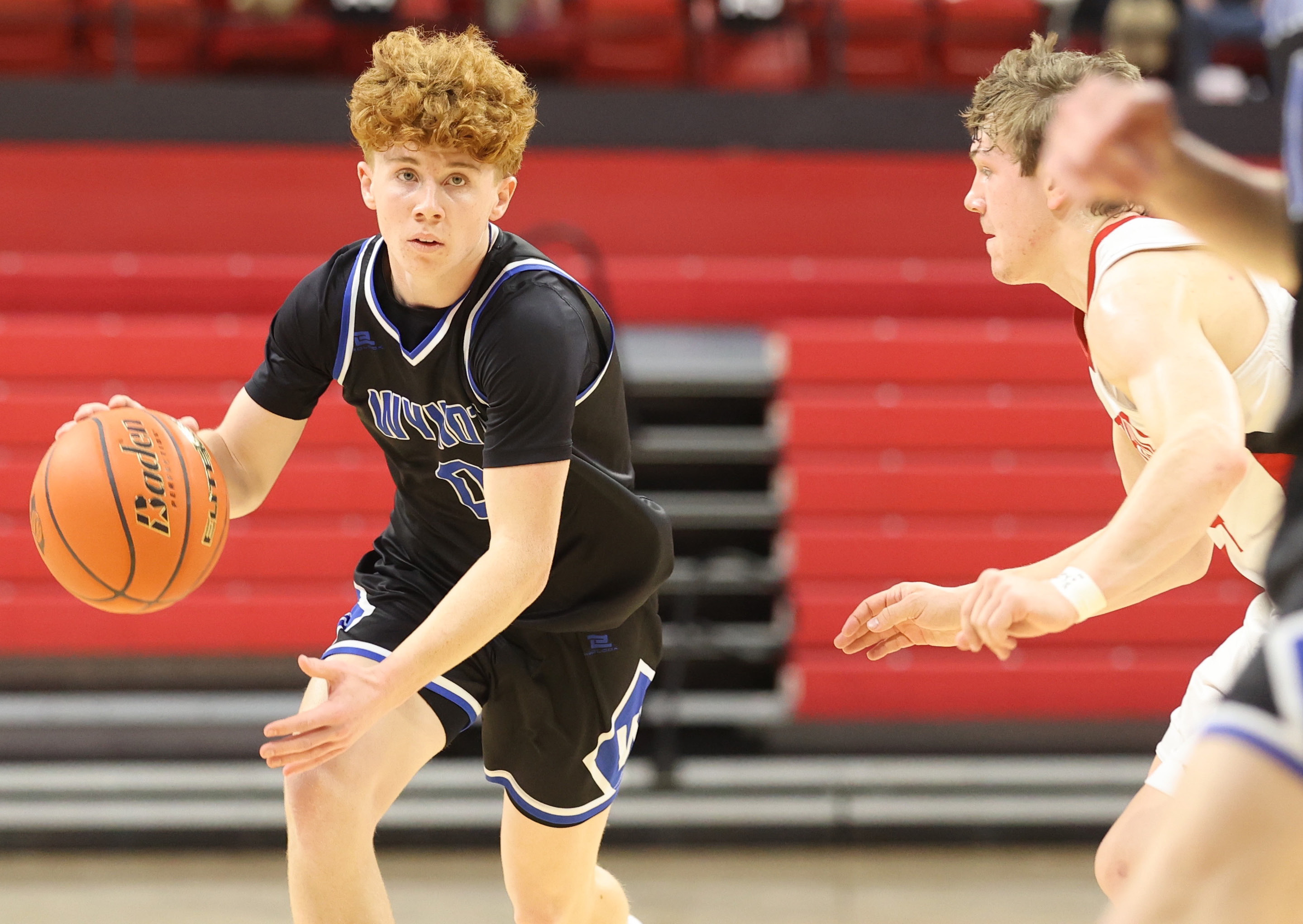 Senior point guard Devin Brummer keeps his eyes up as the Blue Devils work through their offensive set in action against the Cardinals Wednesday night in Lincoln. Jeremy Buss | Cedar County News