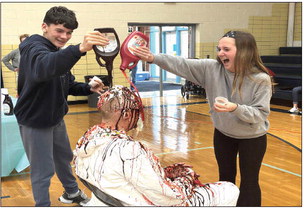LCC Middle School students Jeremiah Kinkaid and Ruby Tasler (r) pour topping on the human made sundae, Mark Leonard.