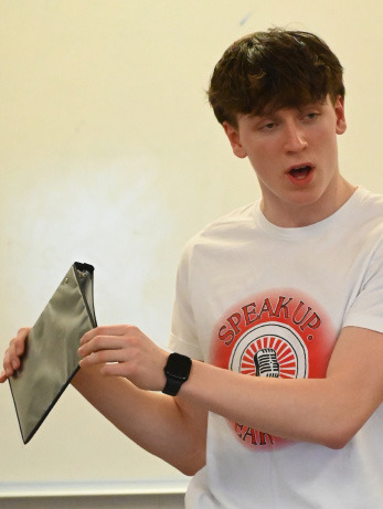 The Hartington-Newcastle and Cedar Catholic speech teams competed Friday in the District meet at Creighton. HNS won the District title, while Cedar took runner-up honors. Landon Rutar (top, left) performs his Oral Interpretation speech 'Time.' (above) Issac Santiago and Dane Gotch perform their duet acting piece. (left) Lainey Morten and Gabe Reyes share a light moment during their performance.