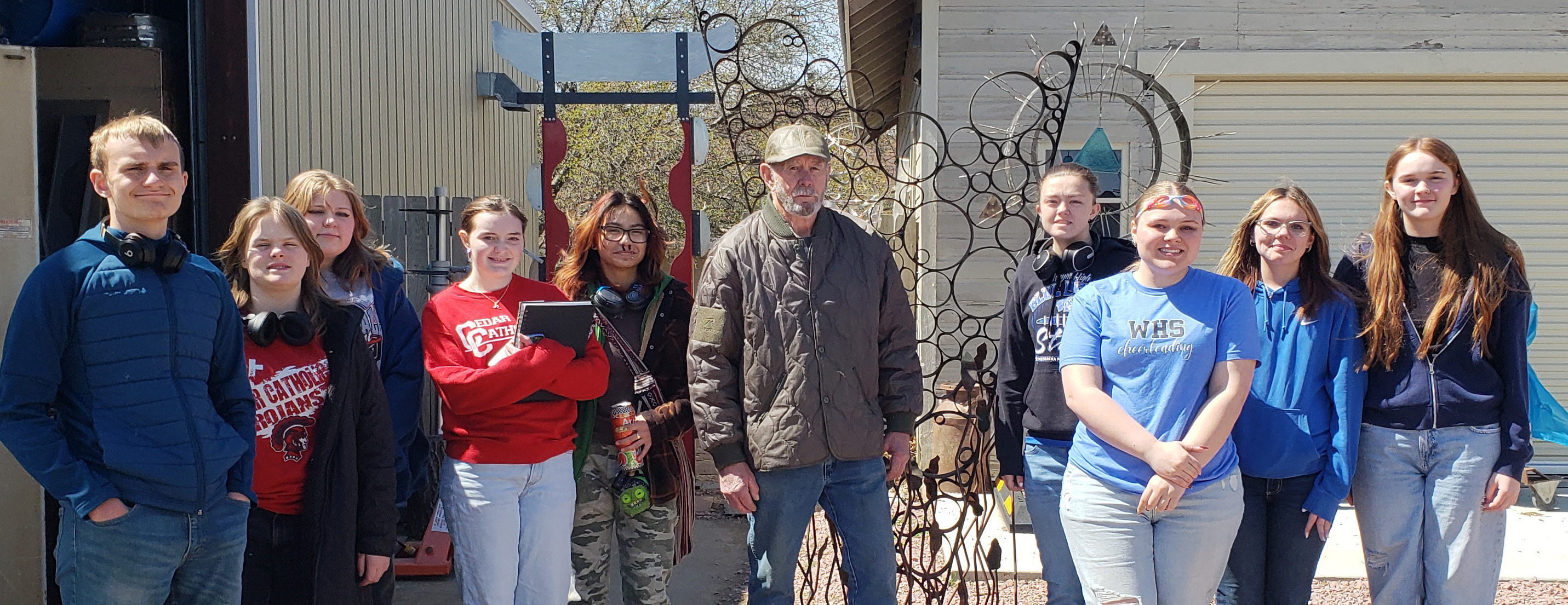 The students who visited sculptor Mr. Mike Fluent are Andrew Klug, Emerson Lammers, Athena Bottolfsen, Anna Bowers, Aeryn Blackburn, Shay Beatty, Mia Kuester, Alexis Adams and Carlee