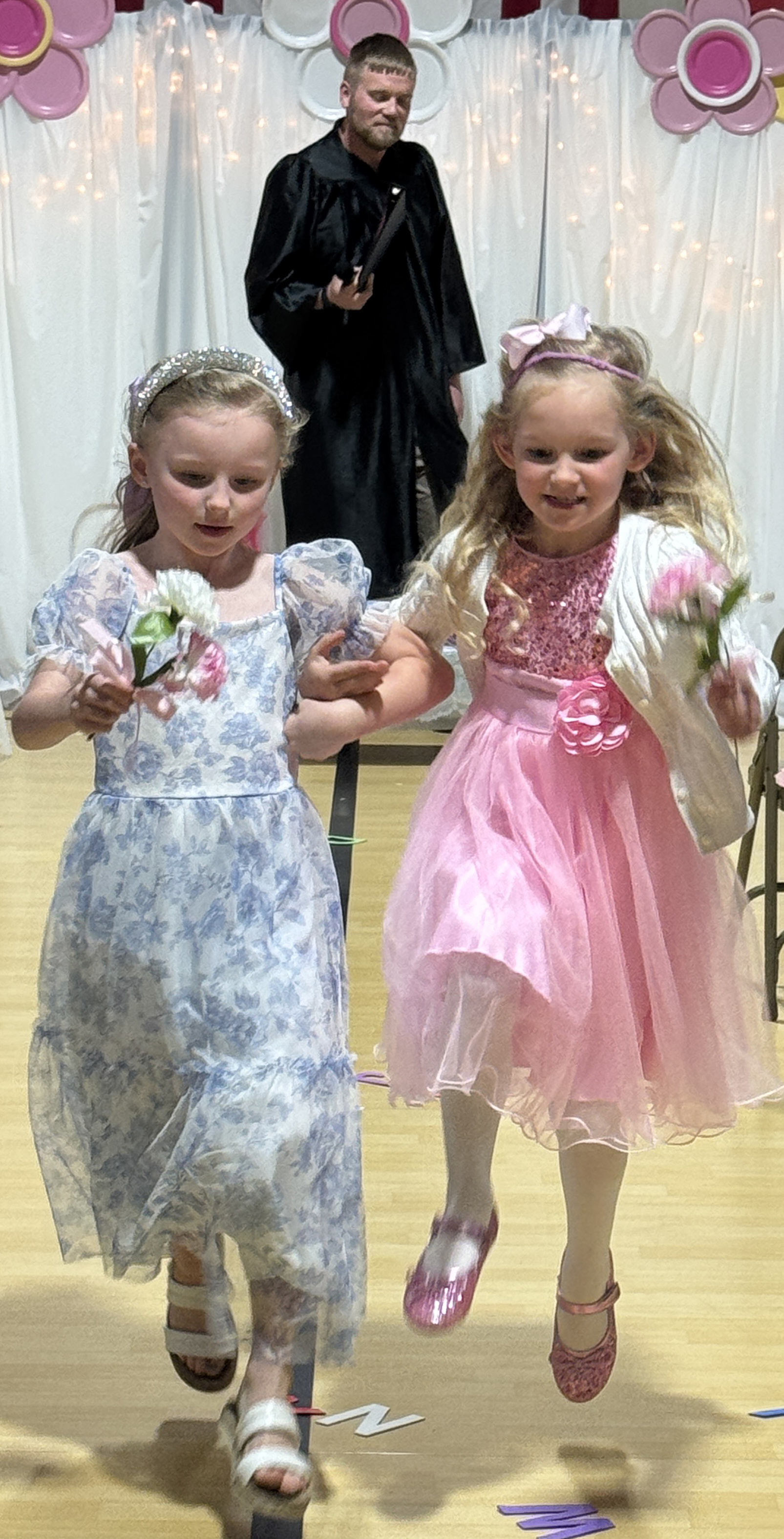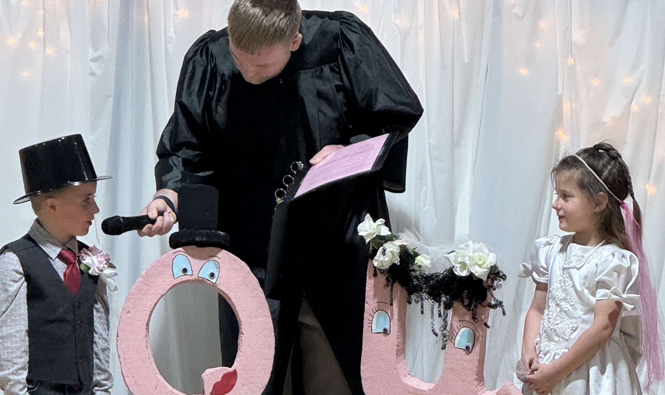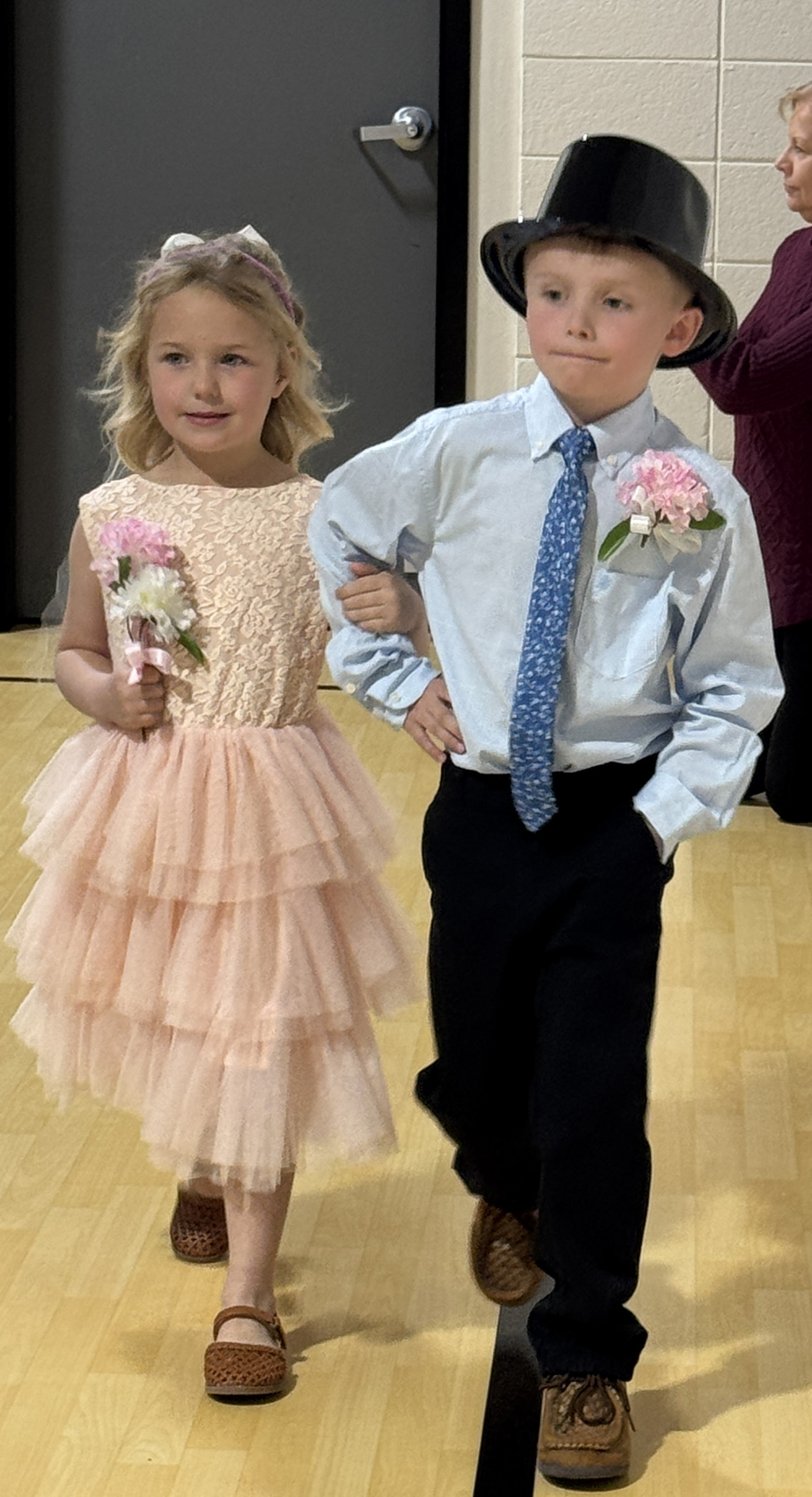 Jackie Loberg | Randolph Times Randolph Elementary students took in the wedding of Q & U on Friday. Parents and Grandparents gathered in the elementary gym for the big event. After the ceremony everyone was invited to watch a video, stay for the dance and have cupcakes and juice. (top left) Bride āUā Anna Burbach stands with the father of the Bride Supt. Daryl Schrunk. (top, right) Rett Kuhl, Denton Beacom, and Anna Burbach during the ceremony as Rett says, āI Do.ā (left) Zoey Gubbels and Rhett Beacom walk down the aisle after the ceremony. (right) Kate Janssen and Drew Backer skipping out after the ceremony.